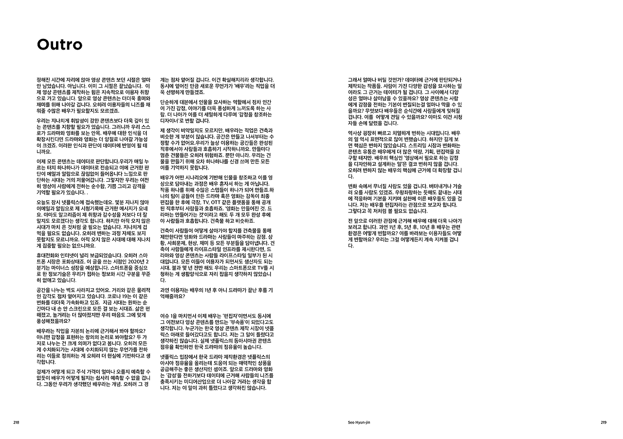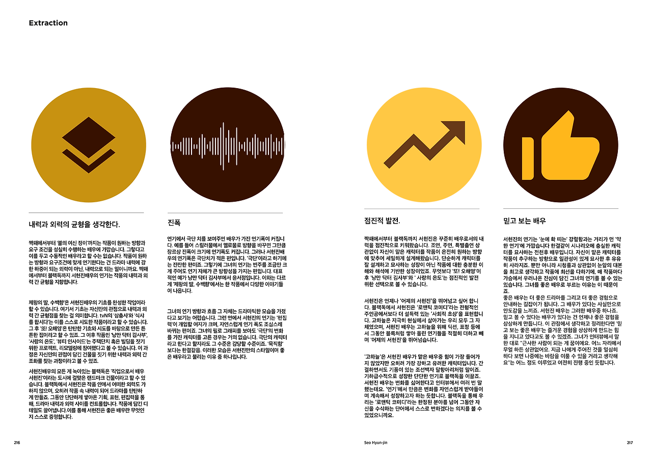 '지난 과거를 바탕으로 최선의 미래를 만들라'는 괴테의 말처럼 과거를 바탕으로 탄탄히 만들어진 자신만의 스타일이란 쉽사리 시들지 않습니다. 그 자체가 쉽게 흔들리지 않는 우아함이기 때문입니다. 발행자의 글에서 적었듯이 '이 매거진'에서는 이리저리 흩어진 서현진배우의 연기에 대한 이야기를 제 관점으로 모아 엮은 것에 불과합니다. 저는 서현진 배우뿐만 아니라 '배우를 보다 더 '직업'혹은 다른 '관점'으로도 바라보는 데 도움이 되면 좋겠다는 생각으로 이슈 1을 적어갔습니다.