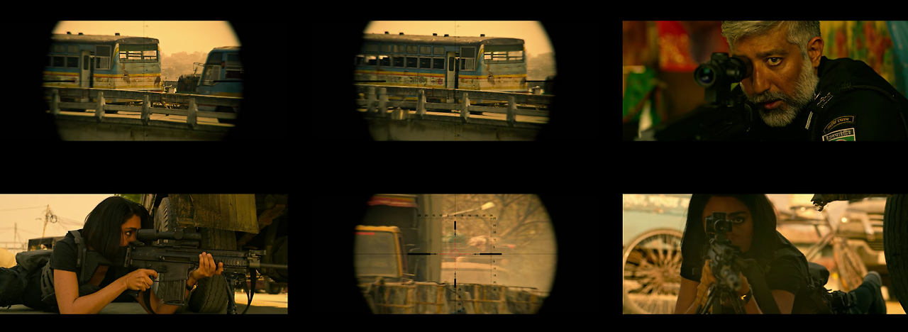 영화에서 총을 쏘거나, 화살 시위를 당기는 장면, 싸우는 장면. 자동차 추격하는 장면들이 대표적인 액션 컷이다. 출처: 익스트렉션 in 넷플릭스.