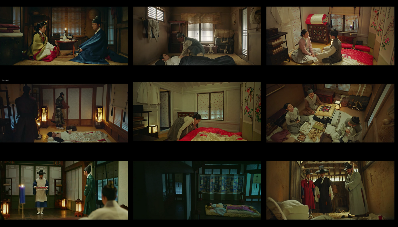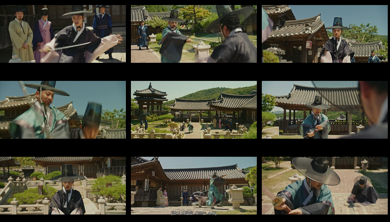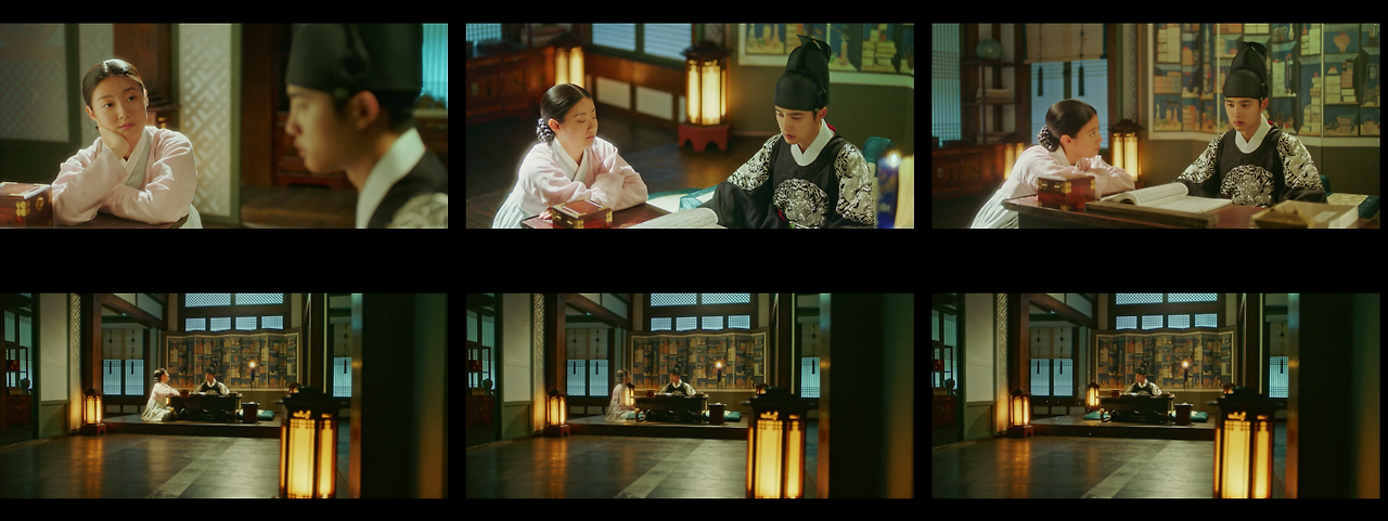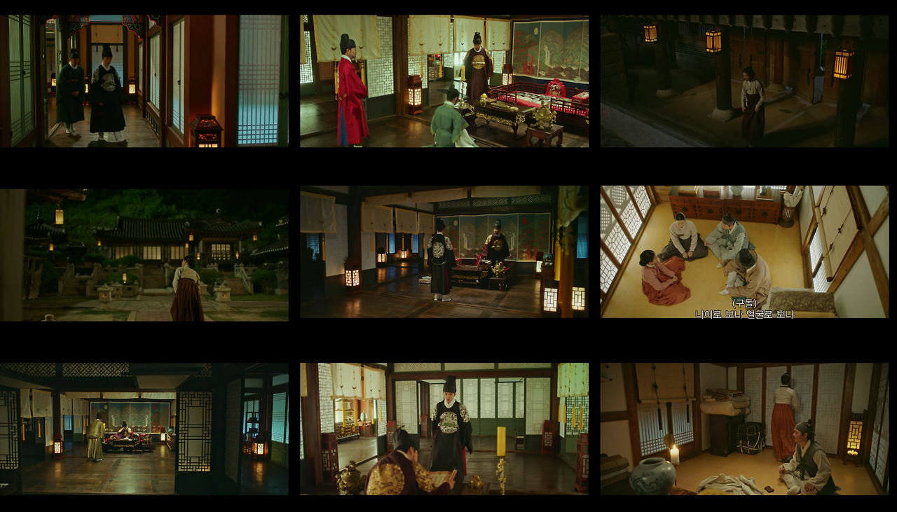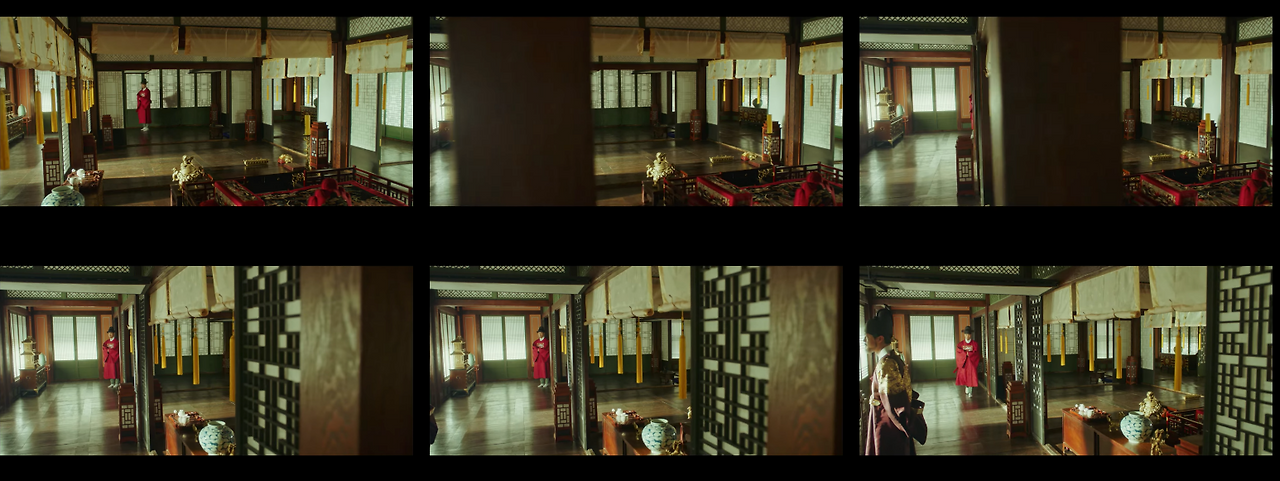 이러한 경우에 풀샷에서 크기를 조금 더 키워 풀샷과 와이드샷의 중간에서 전경을 묘사한다. 물론 궁에서도 종종 와이드샷을 사용한다. 하지만 공간이 가진 한계 때문에 이야기 전개에 필요한 공간보다 피사체가 더 잡혀 공간정보가 산만하다. 이러한 부분은 촬영 문제라기보다는 ‘사극’이라는 제약. 장르 특성 때문에 발생하는 부분이다.