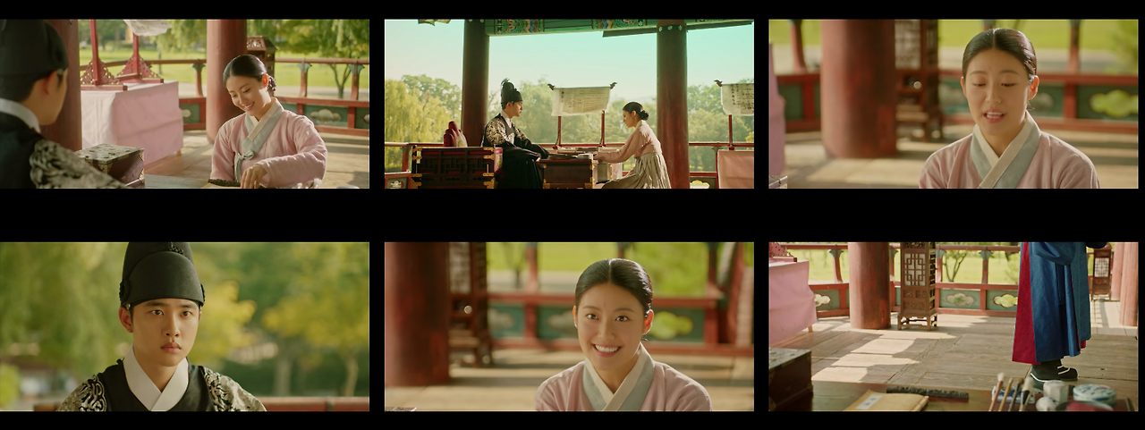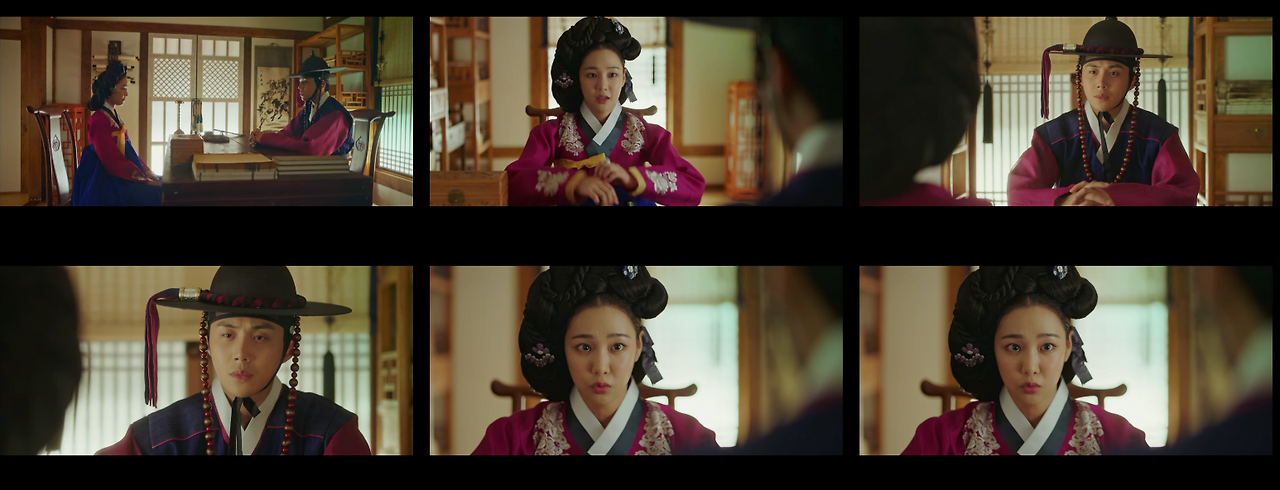 사극은 다른 드라마와 다르게 제한이 많다. 실험적인 샷보다는 정적으로 혹은 절제할 필요가 있다.'백일의 낭군님'도 사극이다 보니 안정적으로 컷을 만들기 위해 180도 법칙을 일괄적으로 적용한다. 당연히 드라마 속 대부분 영상들은 모두 안정적이다.