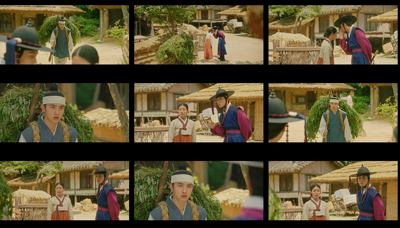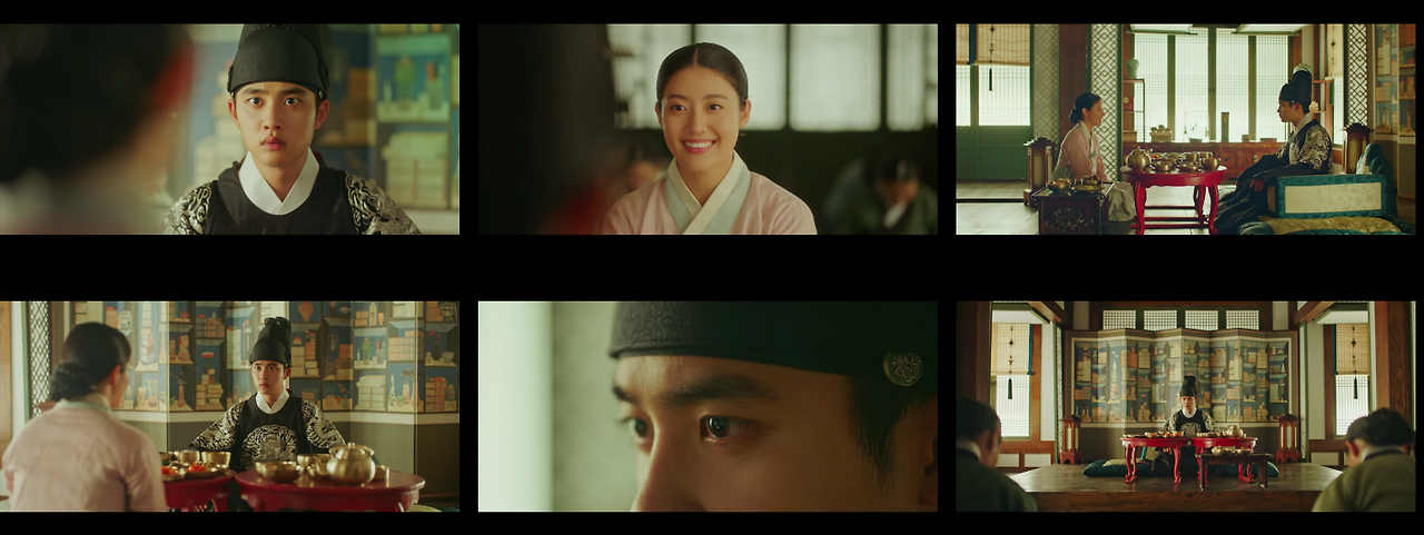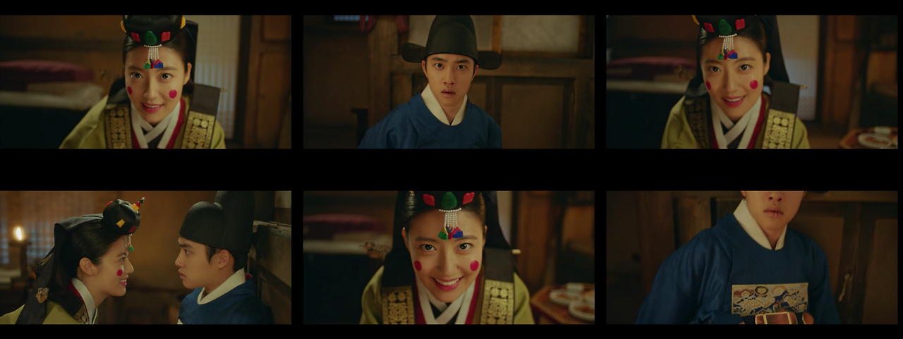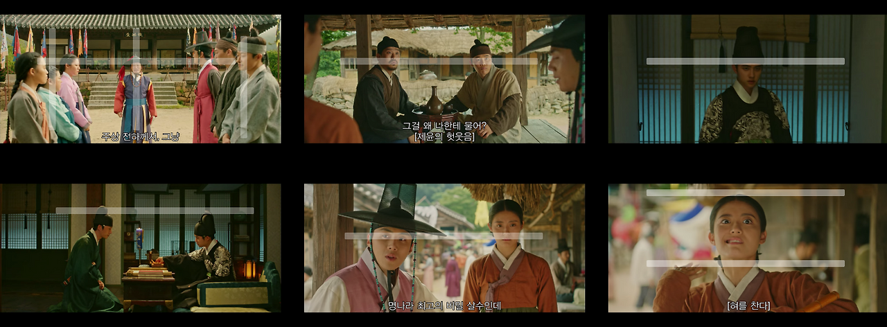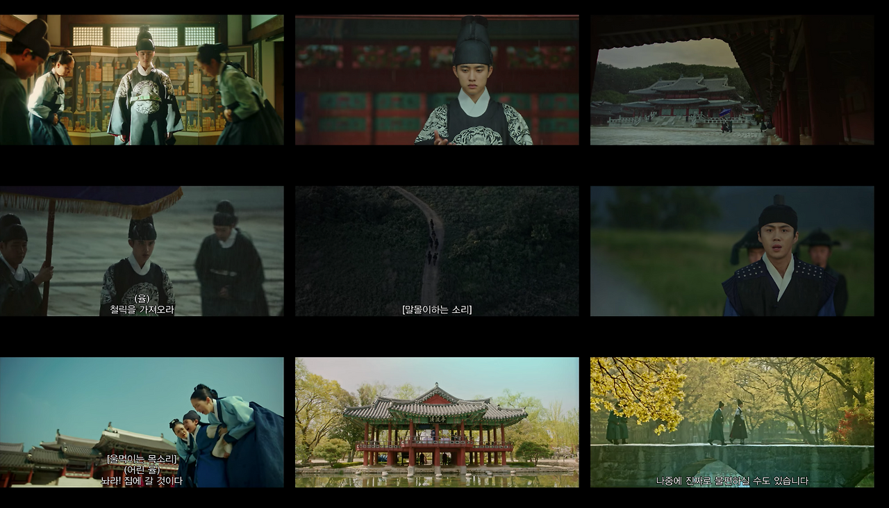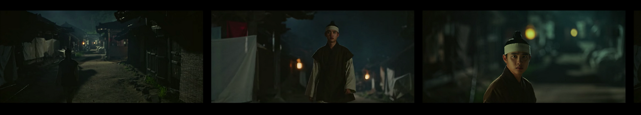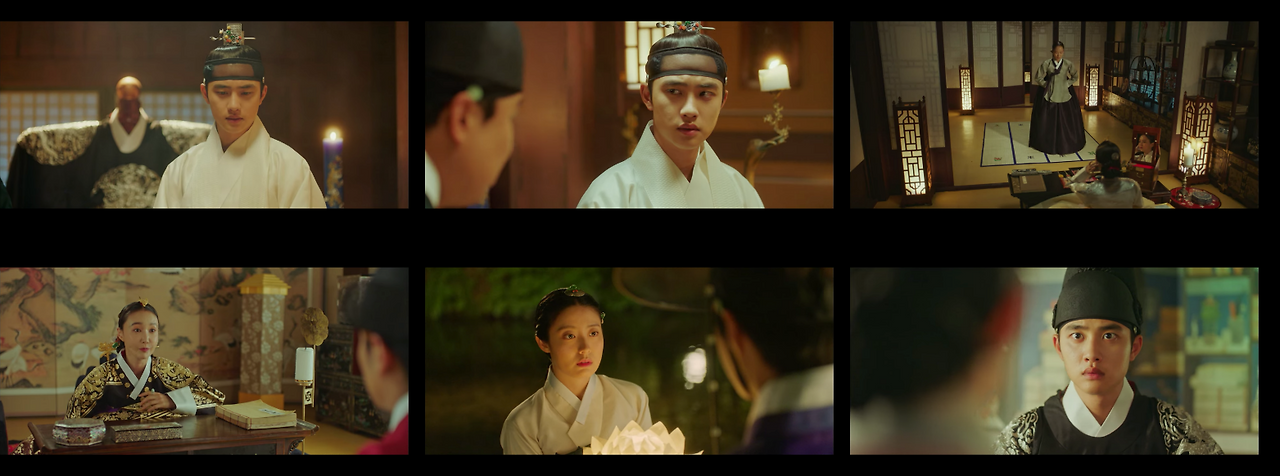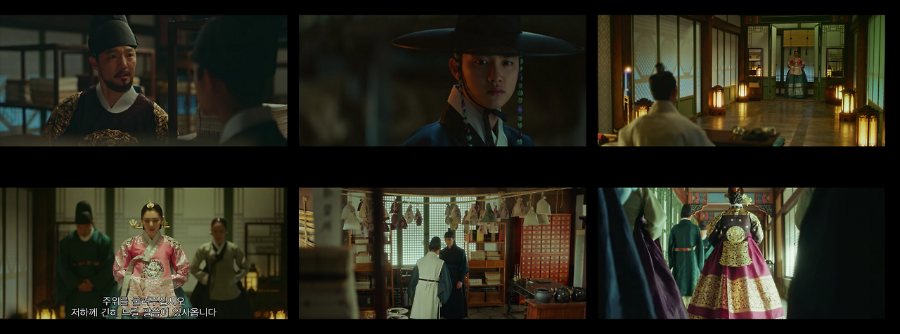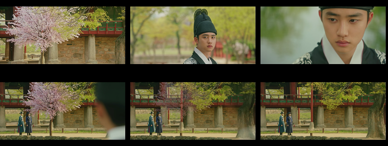 반면에 한양으로 이야기가 넘어가는 경우 콘텐츠 컷 안의 샷들은 송주현과 달라진다. 빛 대비가 커지고 색감도 송주현보다 선명하다. 영상 속 색온도는 낮게 조절했으며, 녹색톤을 많이 집어넣었다. 대리를 올리기 위해 노란색과 붉은색 채도를 올렸다. 이는 1화부터 16화까지 시종일관 일관적이다. 다만 이율(도경수)이 중심이 되는 장면에서는 노란색톤을 올려 이율이 가진 아우라를 일관적으로 연결한다. 이는 이율(도경수)이 나원득(도경수)으로 송주현에서 생활할 때의 일관성과 윤이서에 대한 일편단심을 표현하기 위함이다. 이처럼 색감과 송주현과 구분되는 이야기 정보는 시청자들에게 드라마가 지향하는 반향을 고스란히 전한다.