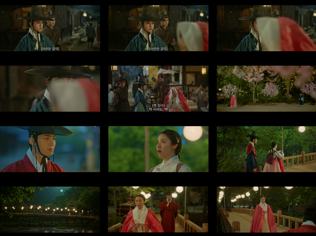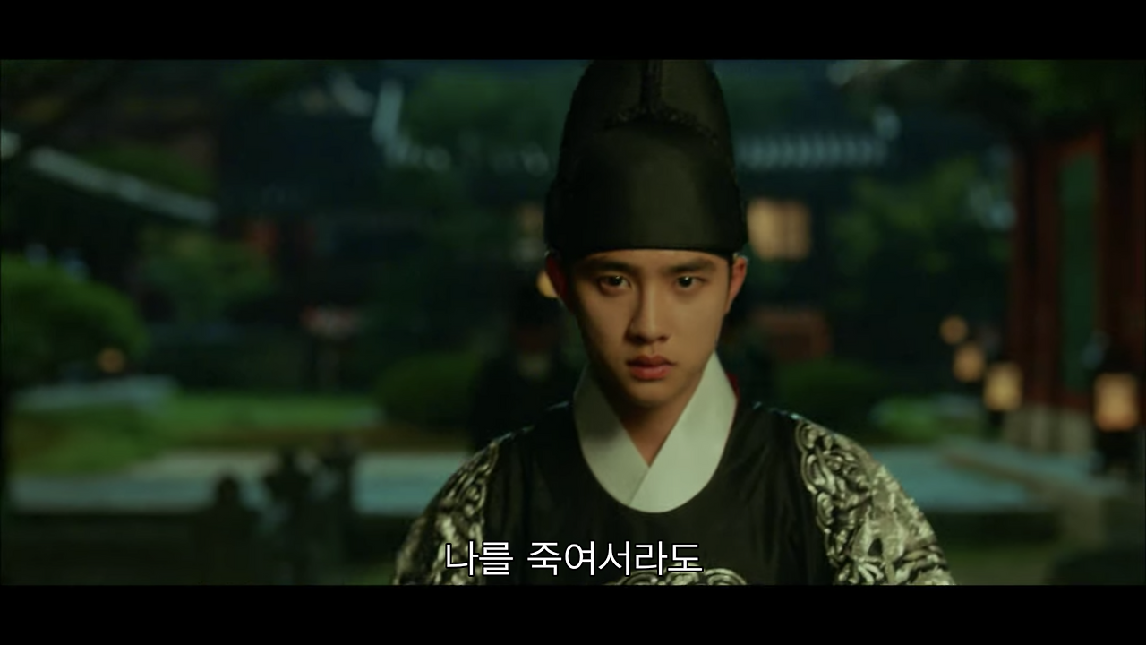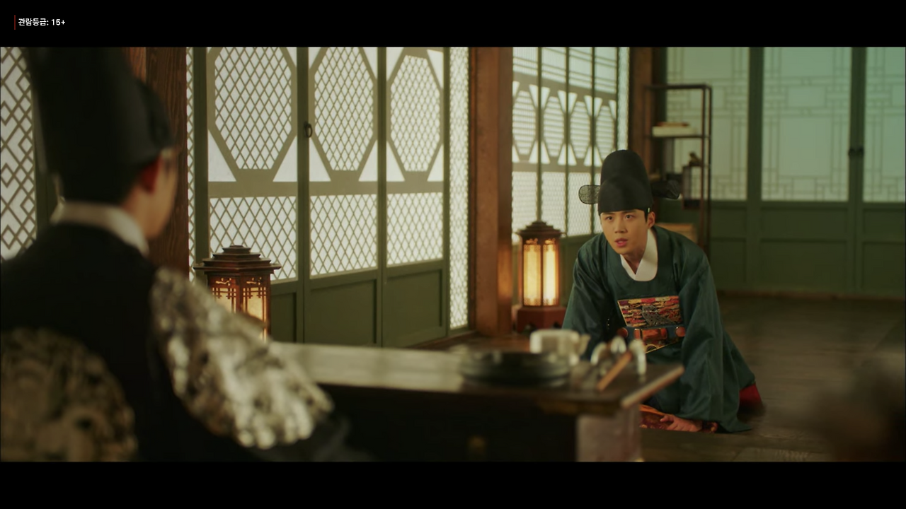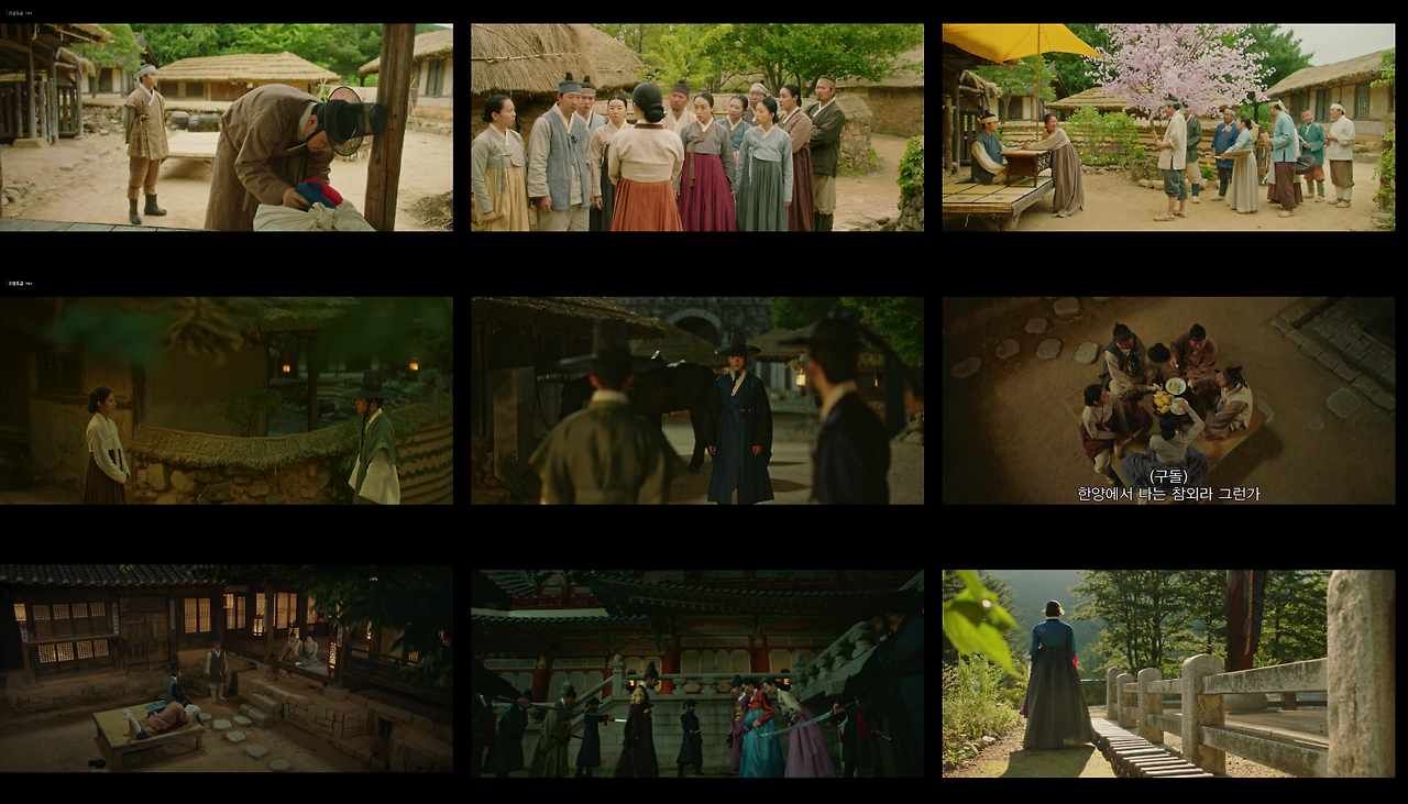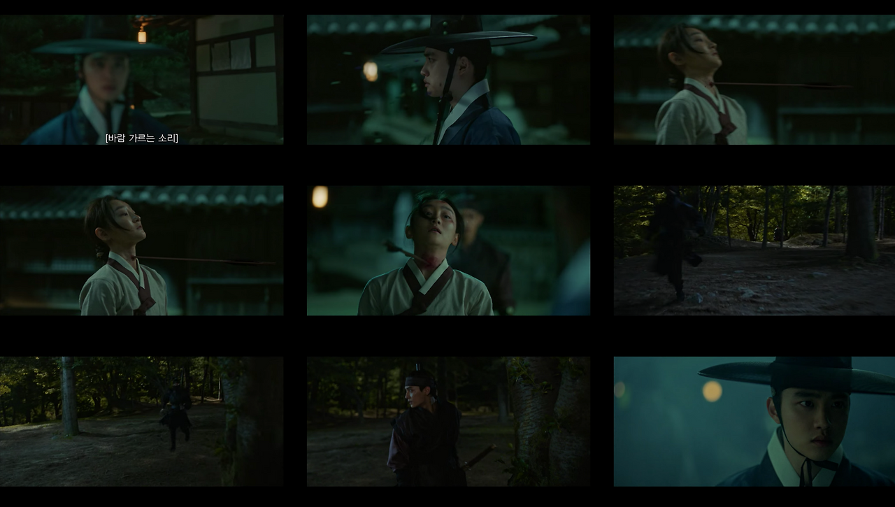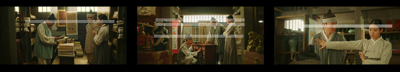 반면에 한양으로 이야기가 넘어가는 경우 콘텐츠 컷 안의 샷들은 송주현과 달라진다. 빛 대비가 커지고 색감도 송주현보다 선명하다. 영상 속 색온도는 낮게 조절했으며, 녹색톤을 많이 집어넣었다. 대리를 올리기 위해 노란색과 붉은색 채도를 올렸다. 이는 1화부터 16화까지 시종일관 일관적이다. 다만 이율(도경수)이 중심이 되는 장면에서는 노란색톤을 올려 이율이 가진 아우라를 일관적으로 연결한다. 이는 이율(도경수)이 나원득(도경수)으로 송주현에서 생활할 때의 일관성과 윤이서에 대한 일편단심을 표현하기 위함이다. 이처럼 색감과 송주현과 구분되는 이야기 정보는 시청자들에게 드라마가 지향하는 반향을 고스란히 전한다.