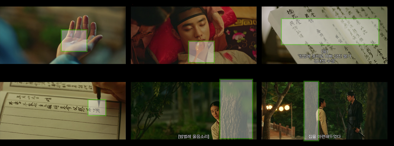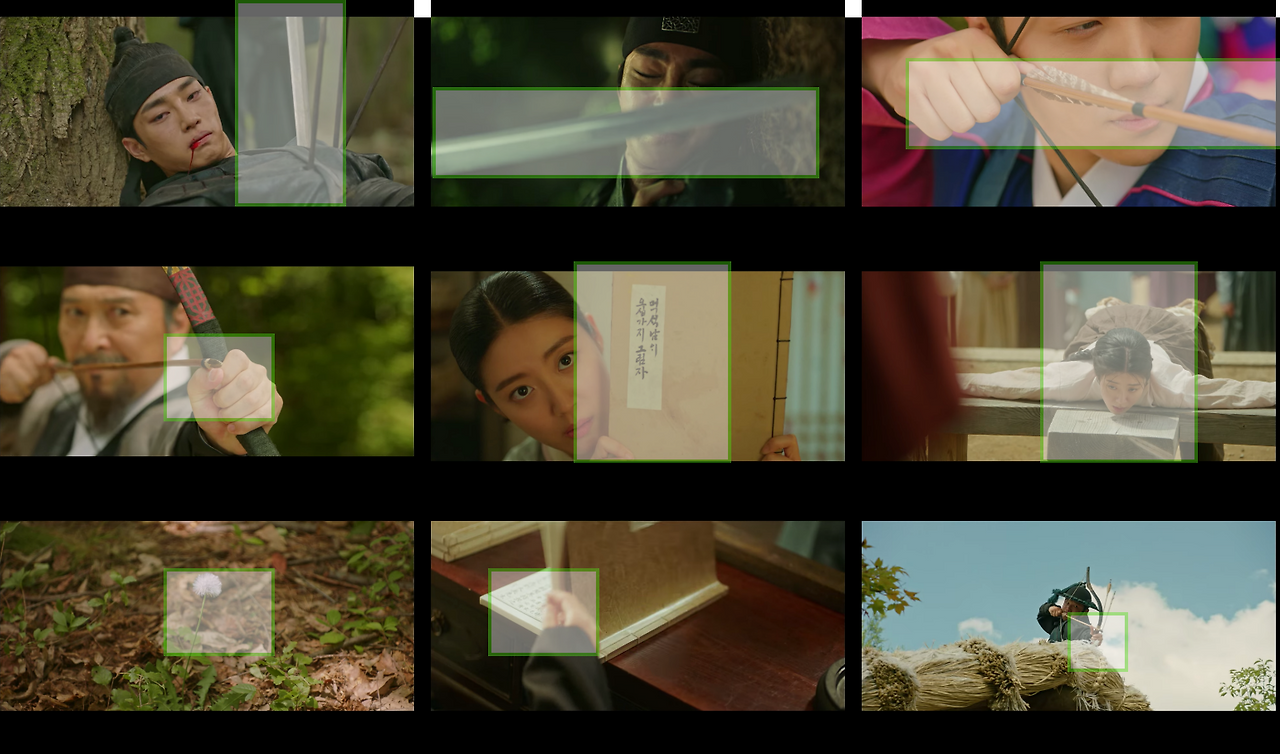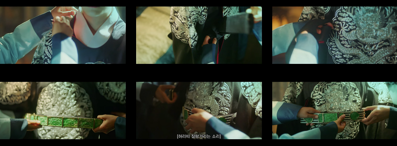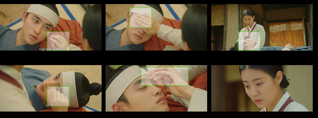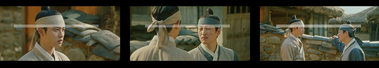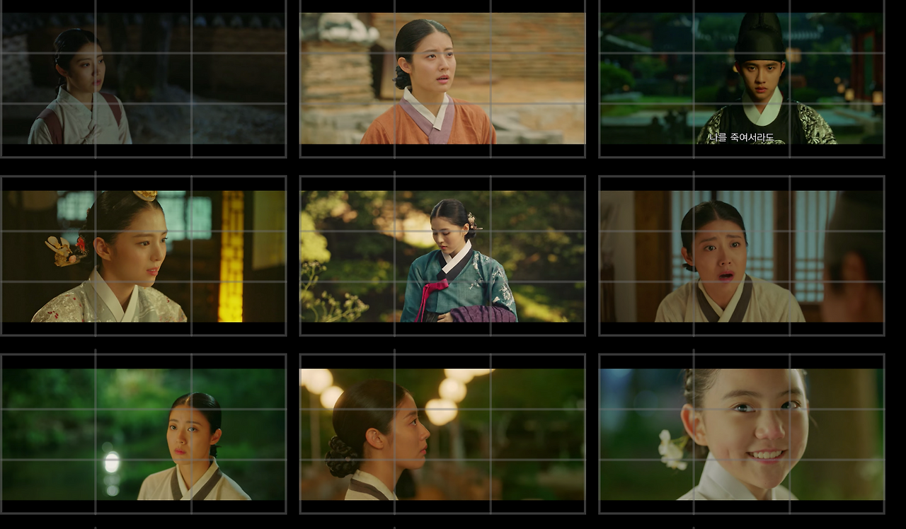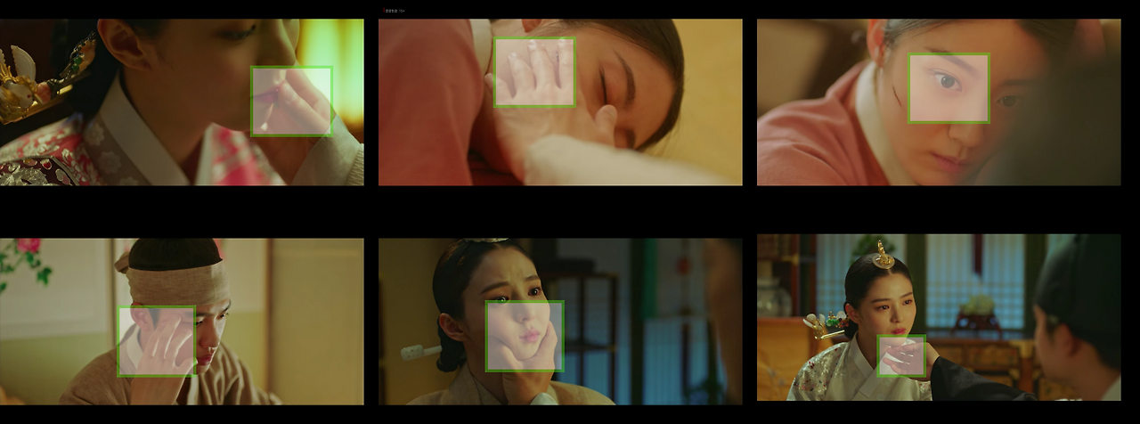자료 사진을 보자. 남지현의 손과 도경수의 눈을 일자로 배치해 영상에서 집중도를 높인다. 손과 눈을 사용해 만든 가이드라인을 액션 컷으로 구성해 디테일한 감정선이 담긴 콘텐츠 컷이 된다. 또한 이율(도경수)이 중전(한소희)의 볼을 손으로 살포시 가져다 놓는 장면. 김차언(조성하)이 중전 얼굴을 손으로 집어 잡는 장면은 가이드라인 자체만으로 감정선을 전한다.