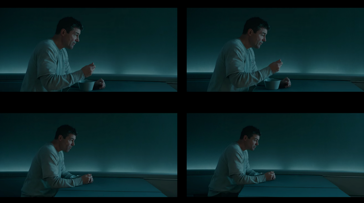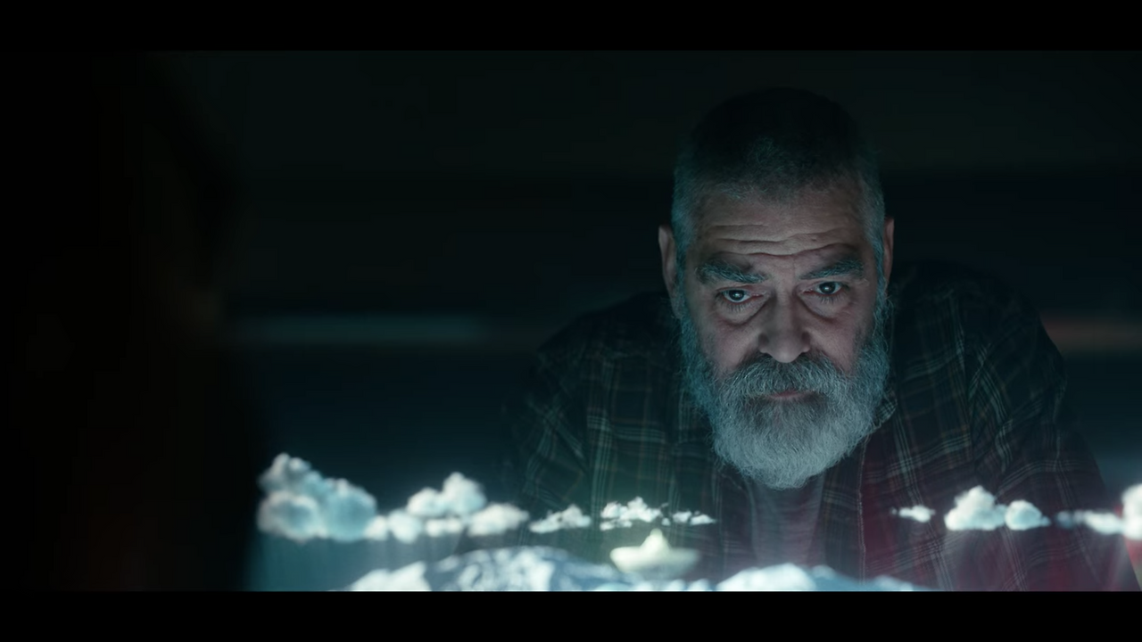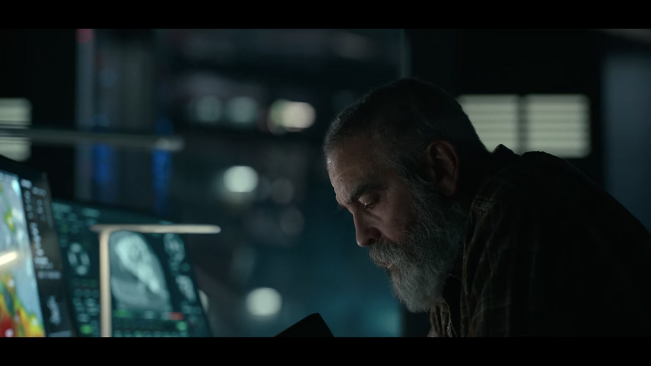 주인공인 오거스틴(조지 클루니)은 이야기를 계속 이끄는 주체다. 당연히 카메라는 자연스럽게 그의 시선, 신체, 모습을 담아낼 수밖에 없다. 지구에서는 등장인물이 오거스틴(조지 클루니) 혼자다. 3분 1법칙과 정중앙 구도의 사용이 효과적일 수밖에 없다. 특정 샷 사용이 과하지도 않다.
