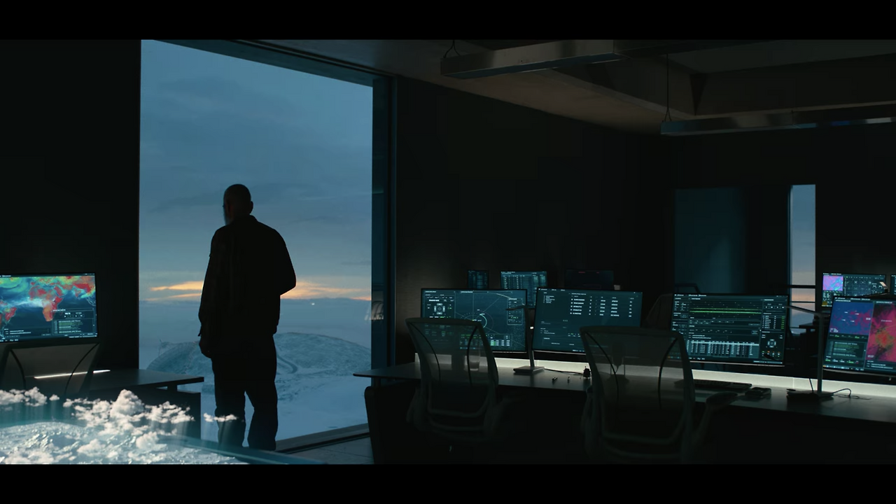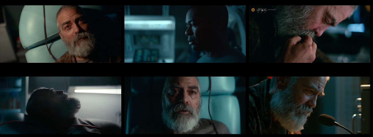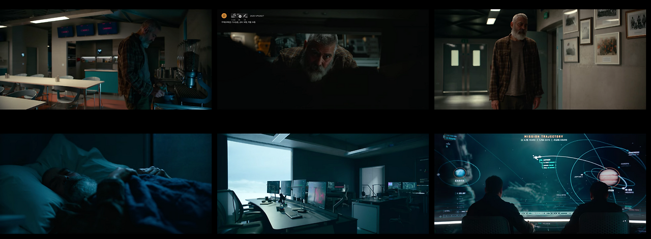 영화에서 가장 많이 나오는 피사체는 오거스틴을 연기하는 조지 클루니다. 제작팀은 조지 클루니의 얼굴.. 오거스틴의 얼굴 표정 안에 색들을 다른 이들보다 조금 더 세말 하게 조절한다. 특히 수염의 질감을 매우 강조한다. 이는 오거스틴이 극을 이끄는 주체이기 때문이다.(조지 클루니가 감독이어서가 아니다.) 어떤 면에서 컬러의 선명 도을 높여 다소 거칠게 느껴질 수도 있다. 하지만 ‘미드나이트 스카이’의 컷 편집 자체가 명료하기에 컬러는 오히려 리듬감을 만든다. 이러한 면은 조지 클루니가 감독을 맡았던 모뉴먼트 맨과 킹메이커에서도 보여주었던 모습이다. 물론 모뉴먼츠 맨과 킹메이커, 미드나이트 스카이는 각각 이야기가 다르기 때문에 동일한 컬러 방식을 사용했다고 할 수는 없지만 컬러를 구축한 방식은 대체로 비슷하다.
