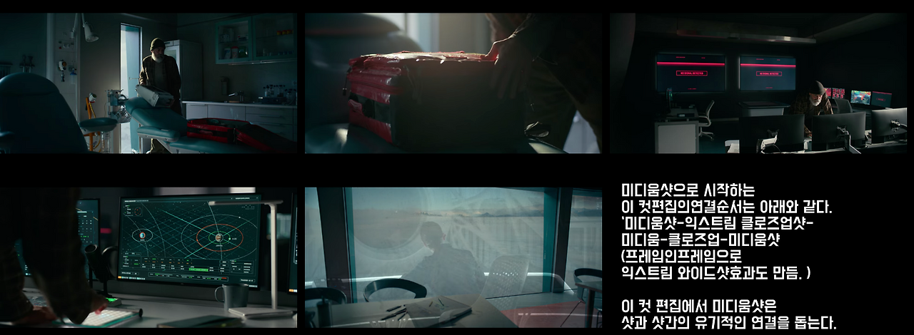 영화에서는 [와이드샷, 미디엄 풀샷, 풀샷]과 [미디엄, 클로즈업, 익스트림 클로즈업샷]의 목적이 명료하기 때문에 컷 편집과 컷 전환 속도도 적절하다. 구성 자체가 말끔하기 때문에 이야기를 매우 편하게 볼 수 있다. 특히 [미디엄-클로즈업], [미디엄-익스트림 클로즈업]으로 샷 전환이 될 때 최대한 이야기 흐름이 이어지도록 컷을 편집했다. 이 덕분에 시청자들이 이야기에 필요한 정보만 전한다.