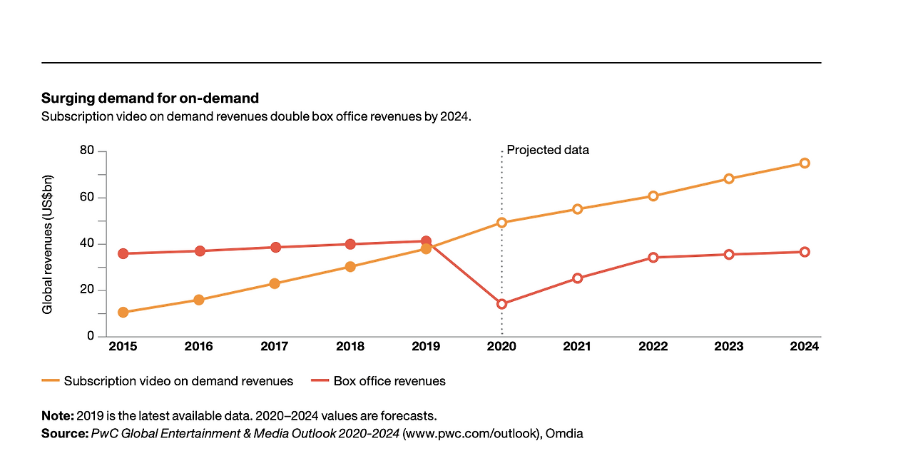 코로나 19를 겪으면서 이 같은 양상은 더 커지고 있다. SVOD(Subscription VOD)의 수요예측은 2024년까지 극장 수요와 비교해보면 2배 정도로 성장하리라 예측하고 있다. 뿐만 아니라 스마트폰을 이용한 영상 콘텐츠를 소비도 고정 방송 소비(케이블, 방송국 송출)와 비교하면 2021년부터 2024년까지 그 격차가 더 커지리라 전망하고 있다. 이는 TV와 스마트폰이 천천히 양 분회 되고 있다는 걸 말한다.