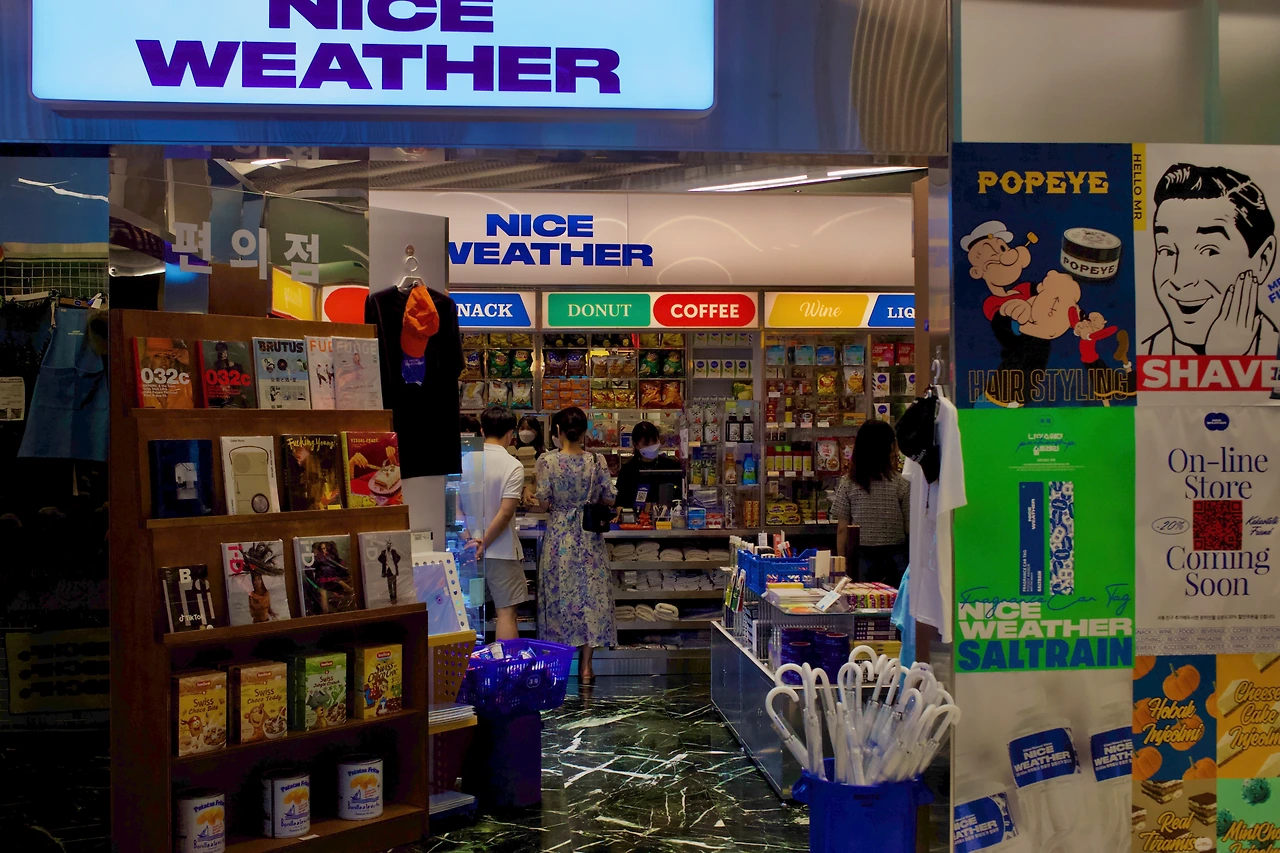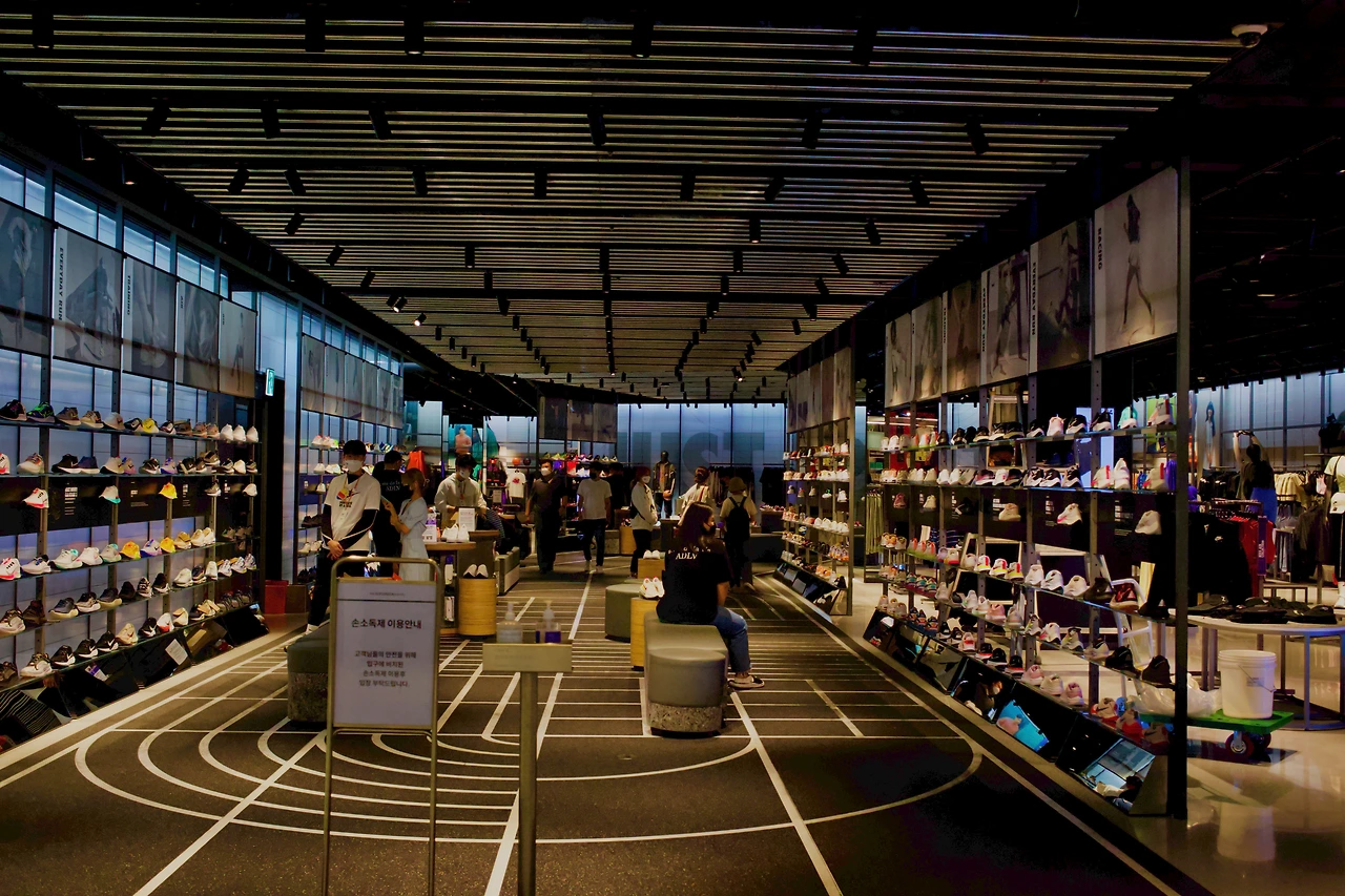 지하 2층에서 공간에 가장 힘은 넣는 곳은 스타벅스 리저브와 'LSRX스틸 북스'다. 스타벅스 리저브의 묵직한 갈색은 공간에 무게감을 넣는다. 그 옆에 '나이스 웨더'와 '번개장터 랩', '나이키 라이즈'까지 공간 힘이 분산되도록 돕는다. 아늑하고 따뜻한 분위기는 번개장터 랩, 나이스 웨더, 반스, 나이키 라이즈까지 점차 날것의 느낌으로 바뀐다. 특히 매장명을 알려주는 LED간판은 이러한 성격을 보다 선명하게 만든다.