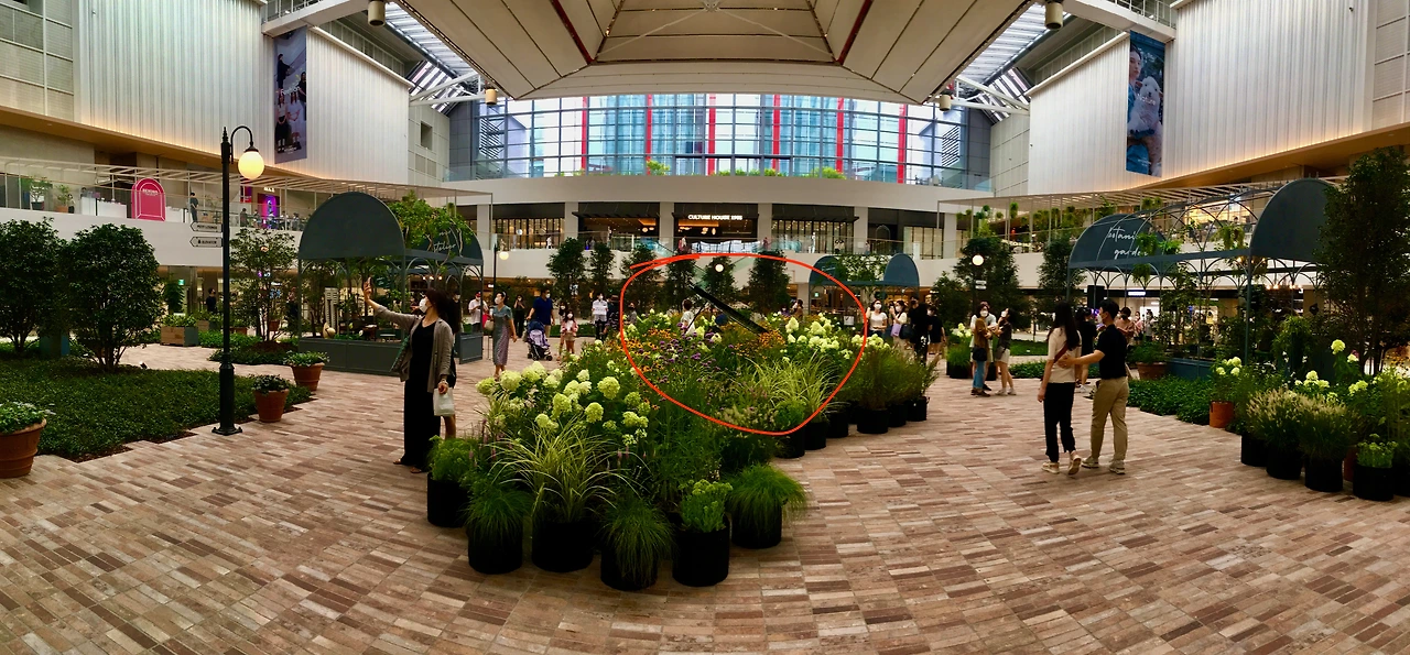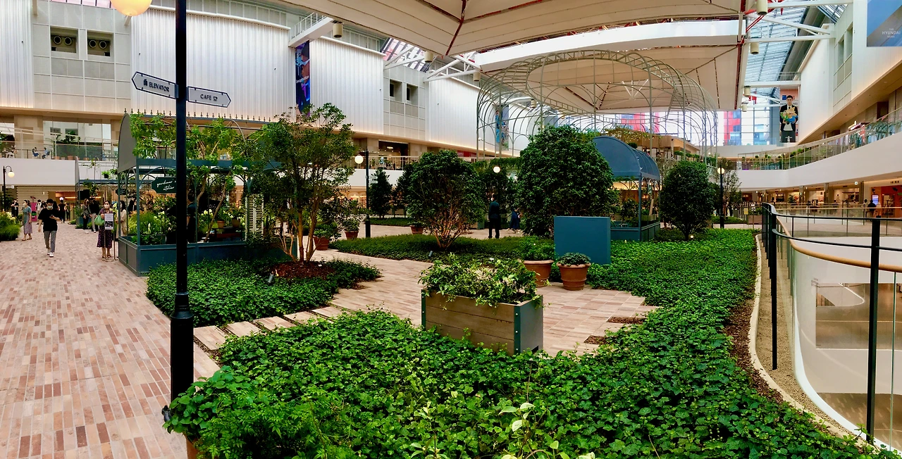 보통 건물에 자연을 끌어오기 위해서는 통유리를 사용하거나, 공간에 꽃꽂이, 화분을 가져온다. 더현대 서울에서는 사운드 포레스트를 제외한 각 공간에 화분을 사용해 계절감을 끌어온다. 하지만 블루보틀같이 꽃이 아닌 녹색식물이라서 계절감보다는 녹음을 끌어온다는 느낌에 가깝다. 이러한 면은 단순히 더현대 서울 공간만을 생각해서는 안된다. 그보다는 주변 지리를 볼 필요가 있다. 도쿄 미드타운 히비야와 롯폰기 같은 경우 히비야는 히비야 공원과 고쿄가 있어서 통유리를 통해 주변 자연을 고스란히 가져온다. 이와 다르게 도쿄 미드타운 롯폰기는 부지 주변에 잔디밭을 설치하고 잔디밭과 연결된 구역 벽을 모조리 통유리와 좌석을 설치해 계절감을 극대화한다.
