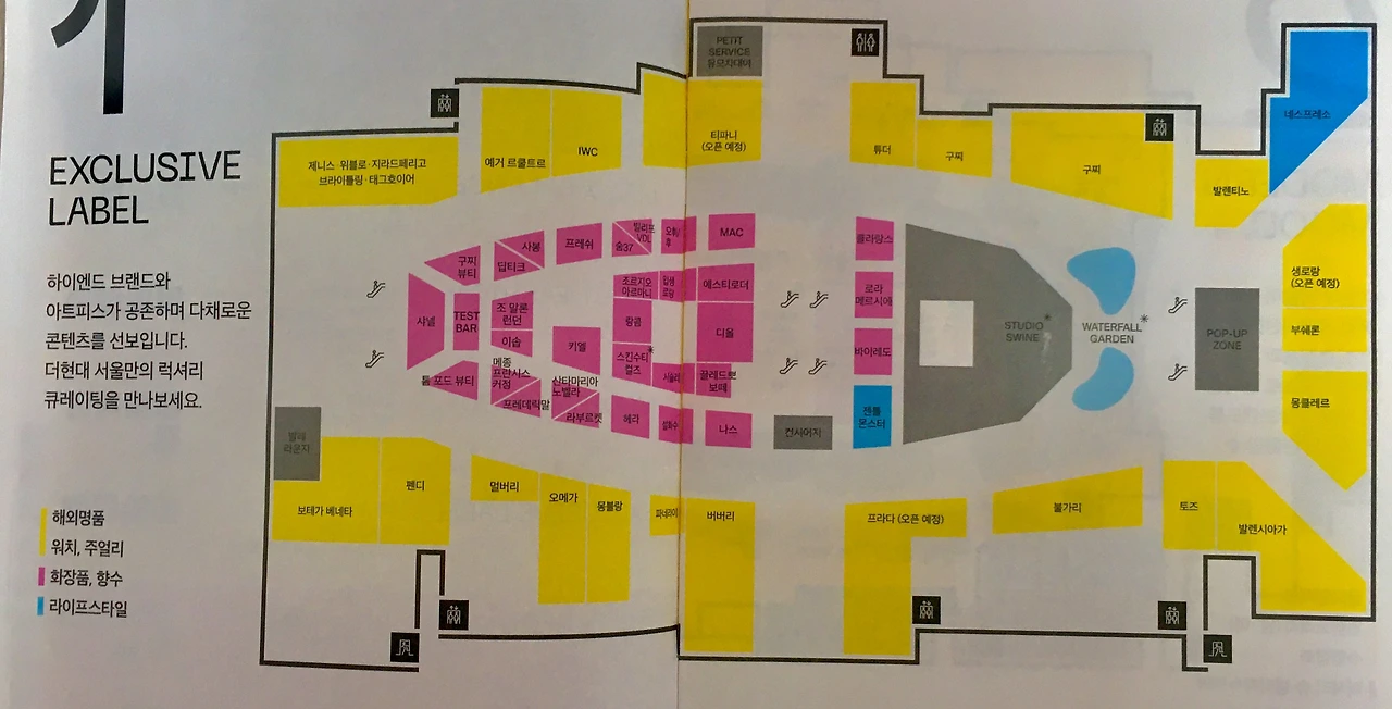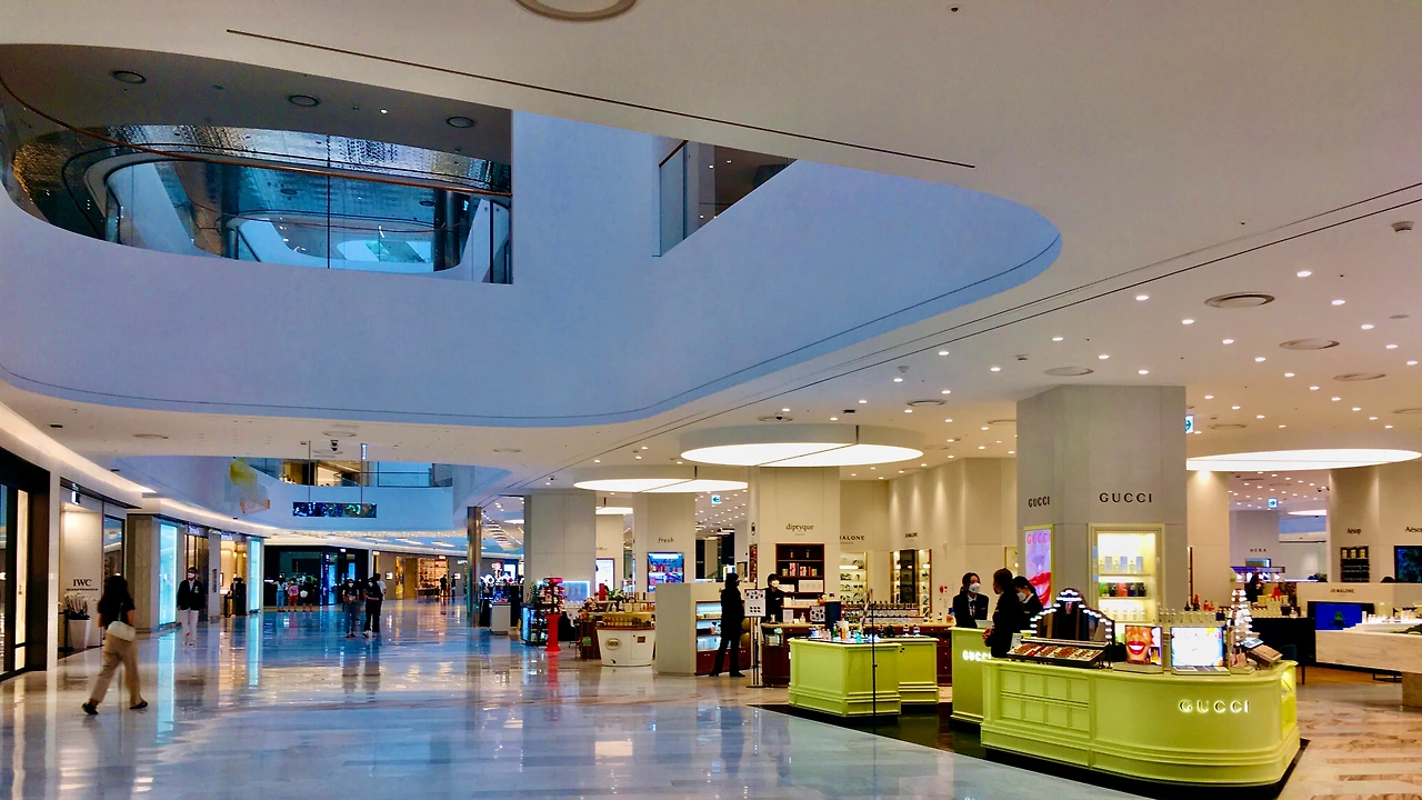 1층의 하이엔드 브랜드 매장들은 '갤러리'를 연상시킨다. 이와 다르게 코스매틱 브랜드들은 유선형으로 배치했다. 사각형 구조로 하지 않는 보이지 않는 파티션 구조로 코스매틱 매장이 하나의 덩어리면서도, 동시에 각 브랜드들로 나눠지게 했다. 코스매틱 브랜드들 주변 벽에 브랜드 이름을 새겨 공간이 죽는 걸 최소화했다. 점적인 전개와 면적인 전개를 혼합한 공간 구획이 좋다. 무엇보다 '구획'을 통해 공간 속의 부드러움을 극대화한 점이 좋다.