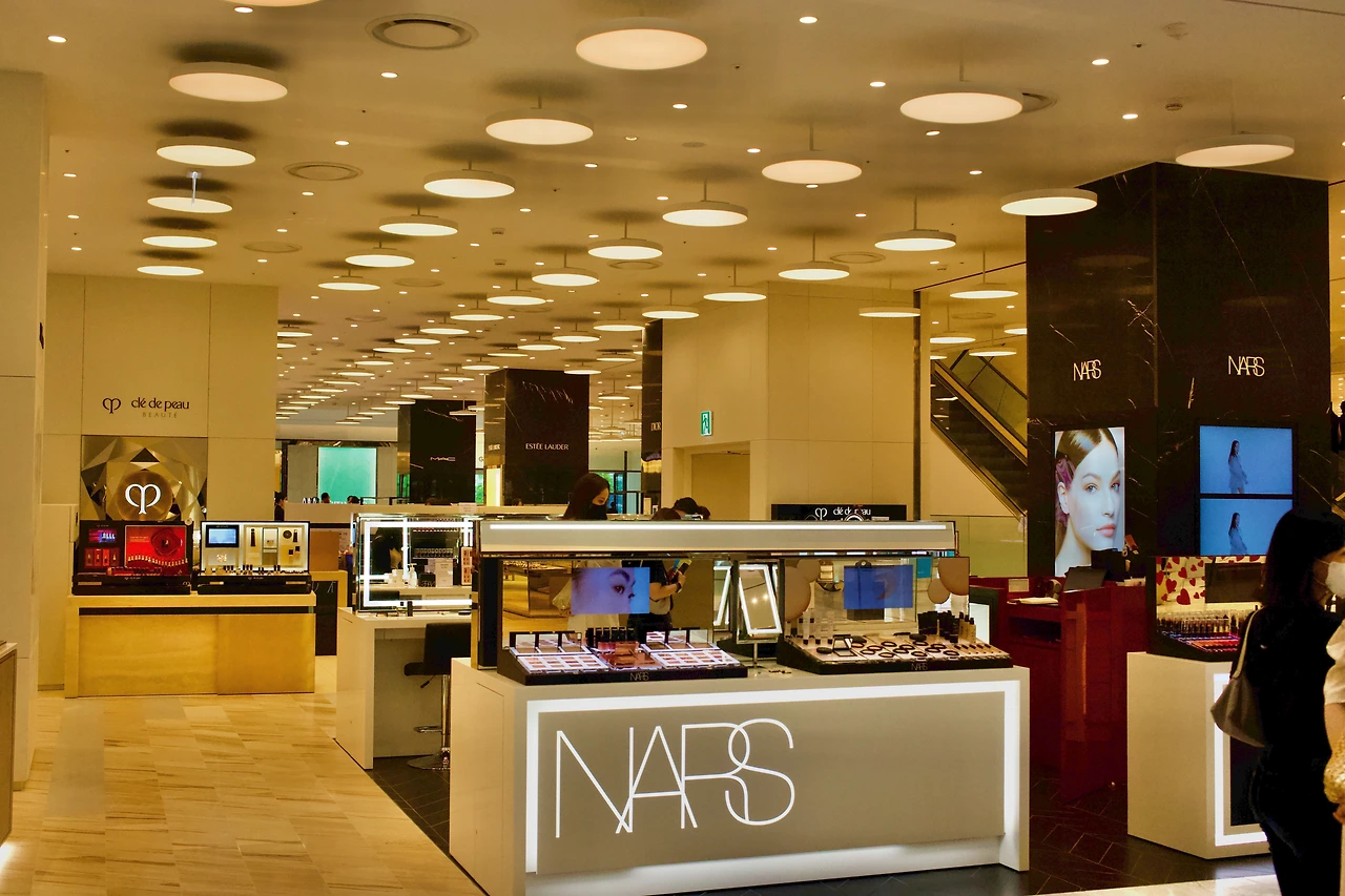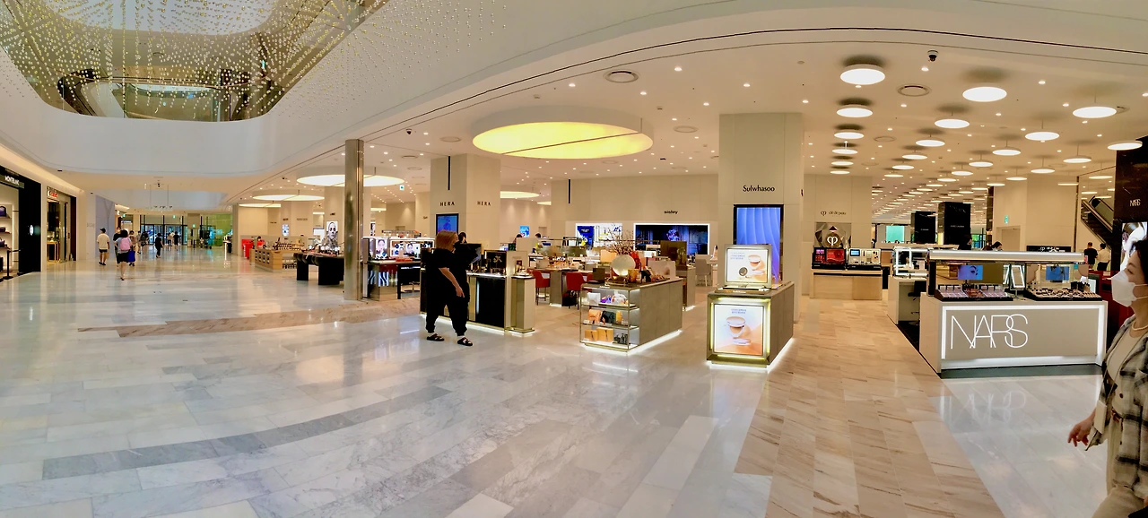 원형 조명 사용이 가장 두드러지는 곳은 1층 코스매틱 매장이다. 코스매틱 매장은 브랜드 파워가 강한 하이엔드 패션매장과 마주하고 있기 때문에 자칫하면 존재감이 미미해질 수 있다. 일단 앞서 말한 대로 코스매틱 브랜드 매장들 근처 대리석 벽에 브랜드 이름을 새겨 사람들이 보다 직관적으로 브랜드를 알아볼 수 있게 했다. 특히 기하학적인 느낌을 주는 원형 조명을 대량으로 사용해 바닥과 상하 대비를 만들었다. 이 덕분에 공간 위아래에서 기하학적인 공간패턴이 만들어진다.