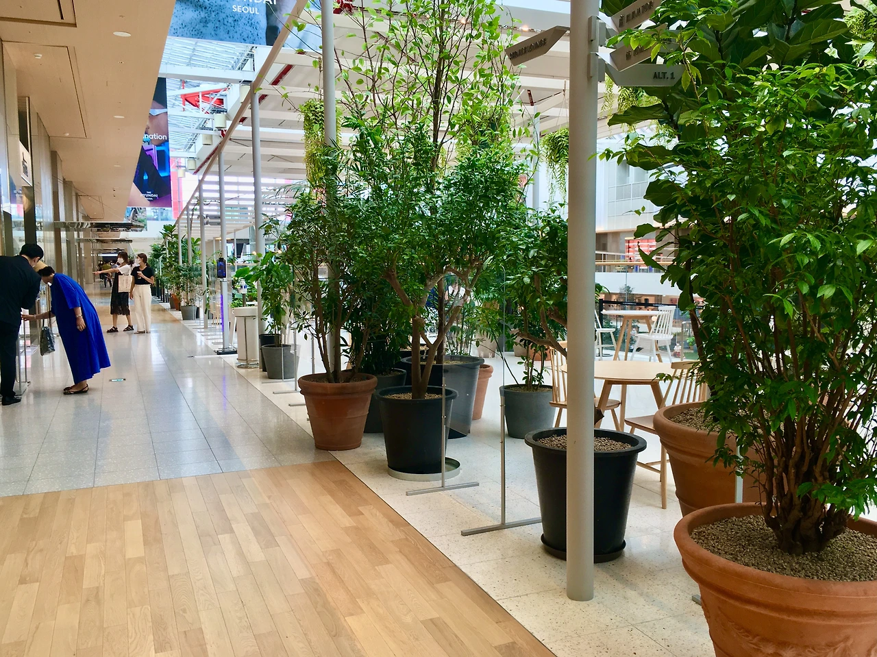식물은 어느 공간에서든지 항상 계절을 보여준다. 이 같은 점에서 식물은 다른 어떤 소재보다 뛰어나다. 특히 나무에 맞설 소재는 거의 없다. 봄에 움트는 새싹이 품은 싱싱함, 여름내 푸른 잎이 빚어내는 그늘, 가을 단풍, 헐벗거나 혹은 하얀 눈으로 가득 찬 겨울 풍경 등을 대신해줄 소재는 없다. 그나마 쉼 없이 변해가는 계절을 가장 가까이에서 느끼게 해주는 소재가 나무다. 나무는 공간에 깊이를 더하며 공간 안에 다양한 원근감을 만드는 일에도 사용된다. 이를 위해서는 나뭇잎의 색과 크기를 조정하면 된다. 잎이 큰 나무를 앞에 놓거나, 잎이 작고 가녀린 나무를 안쪽에 배치하면 원근감이 커진다. 특히 '더 현대 서울'내부 공간을 파노라마 사진으로 촬영해보면 식물 사용이 매우 두드러진다는 걸 알 수 있다.