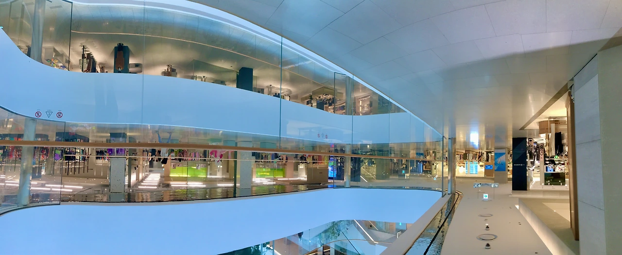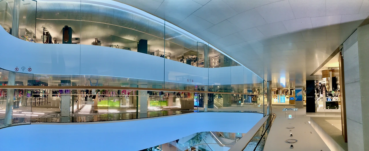 내가 '더 현대 서울'에 들어가자며 떠오른 장소는 도쿄 미트다운 롯폰기였다. 차분하게 정렬된 공간들. 부드러운 음악 선율과 차분한 분위기 때문이었을까? 하지만 더현대 서울의 공간은 도쿄 미드타운 롯폰기와 비슷하면서도 다르다. 물론 도쿄 미드타운 롯폰기는 롯폰기라는 ‘고급스러움’을 반영하고자 일본 특유의 직선미를 강조했다. 반면에 '더 현대 서울'은 도쿄 미드타운 롯폰기와 다르게 곡선미를 다채롭게 사용해 직선과 곡선 간 '조화'를 추구한다. 무엇보다 사람들이 편하게 백화점에서 편안함을 느낄 수 있도록 건물 통로와 벽을 곡선으로 마무리했다.