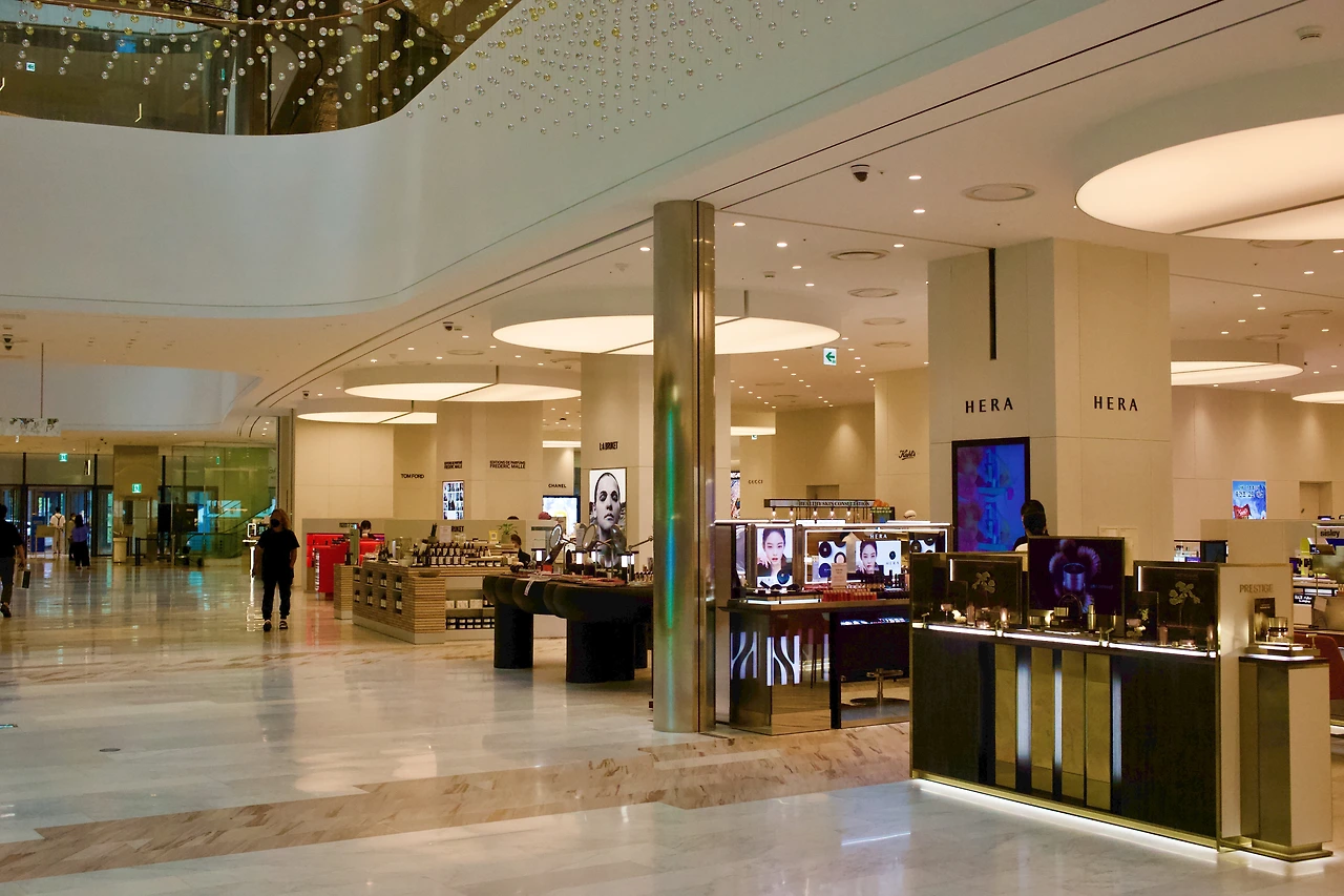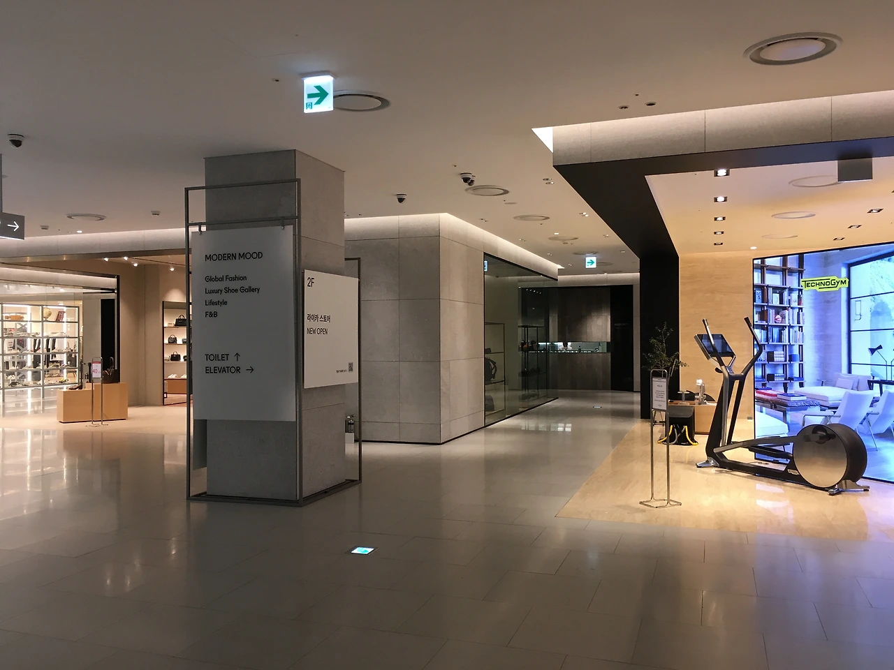 또한 천장이 낮은 구역에 코스매틱 매장을 일괄 배치해 사람들이 코스매틱 브랜드에 집중하도록 만들었다. 여기서 끝이 아니다. 코스매틱 매장 주변에는 6층 천장으로부터 빛이 내려온다. 이러한 빛은 코스매틱 매장 주변을 ‘중정’ 같이 만든다. 지상 2-4층 일부 통로 천장에는 은빛 텍스처를 설치해 빛이 부분적으로 반사되게 만들어 세련되면서 공간이 칙칙해지는 걸 방지했다.