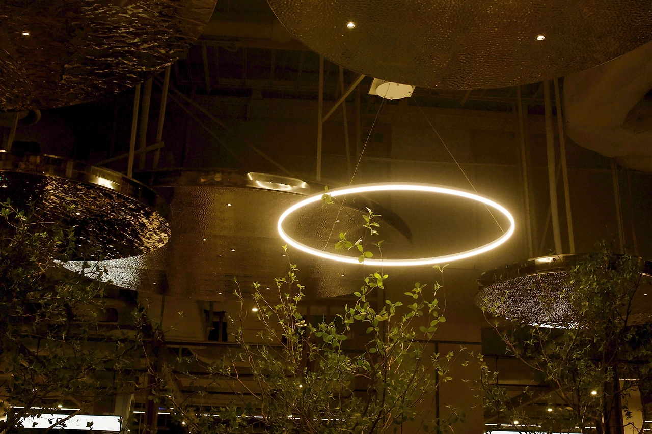위는 곡선이다. 아래는 직선이다. 상하 대비를 통해 만들어진 기하학적 공간은 공간에 변주를 준다. 여기에 더해지는 부드러운 재즈는 코스매틱 브랜드가 가진 부드러움을 강조한다. 참고로 내가 방문했을 때 음악은 부드러운 피아노 선율이 인상적인 비지 아데어의 음악이었다. 지하 1층 F&B매장에서도 곳곳에 원형 조명을 사용해 공간에 산뜻함을 주었다.