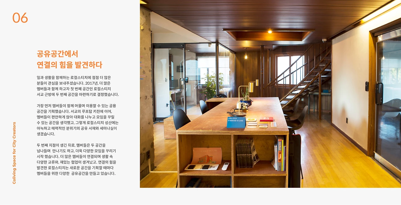호텔은 아니다. 그렇다고 셰어하우스도 아닌 공간을 생각했다. 그들은 이것을 구현하기 위해 공간에 코 리빙, 코워킹을 더하기로 했다. 이렇게 생겨난 게 로컬 스티치다. 로컬 스티치는 멤버들이 언제 어디서든지 원하는 방식과 모습으로 일하는 기를 원한다. 도시를 살아가는 개인. 그 개인이 가진 콘텐츠가 도시를 창의적으로 채우기를 원한다. 이를 지원하는 공간. 사람들이 성장할 수 있는 커뮤니티를 구축하는 일. 이것이 로컬스티치가 지향하는 공간이다.