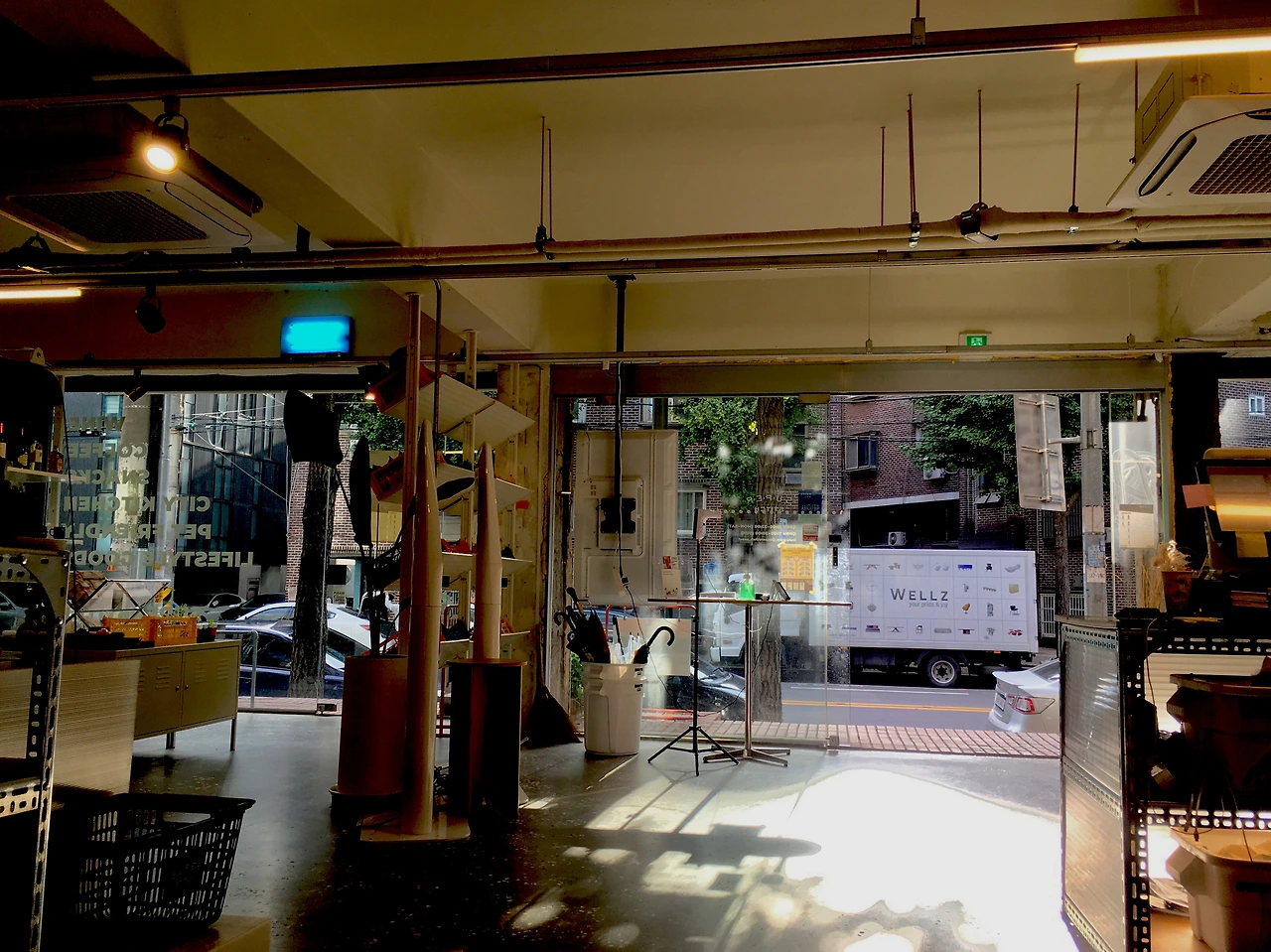 로컬 스티치 서교 2점의 정문에 들어가는 문은 작다. 주변 서교동 거리의 동네 상점에 들어가는 것과 크게 다를 게 없다. 길가와 자연스럽게 연결된 정문. 가로수를 마주하는 유리창을 통래 햇빛이 자연스럽게 들어온다. 자연스럽게 들어오는 햇빛. 이를 통래 로컬 스티치가 지향하는 ‘자연스러움’ 임을 알 수 있다. 특히 시간대로 들어 자연 자연스러운 빛은 공간 안에 서교동의 정서를 자연스럽게 스며들게 한다.