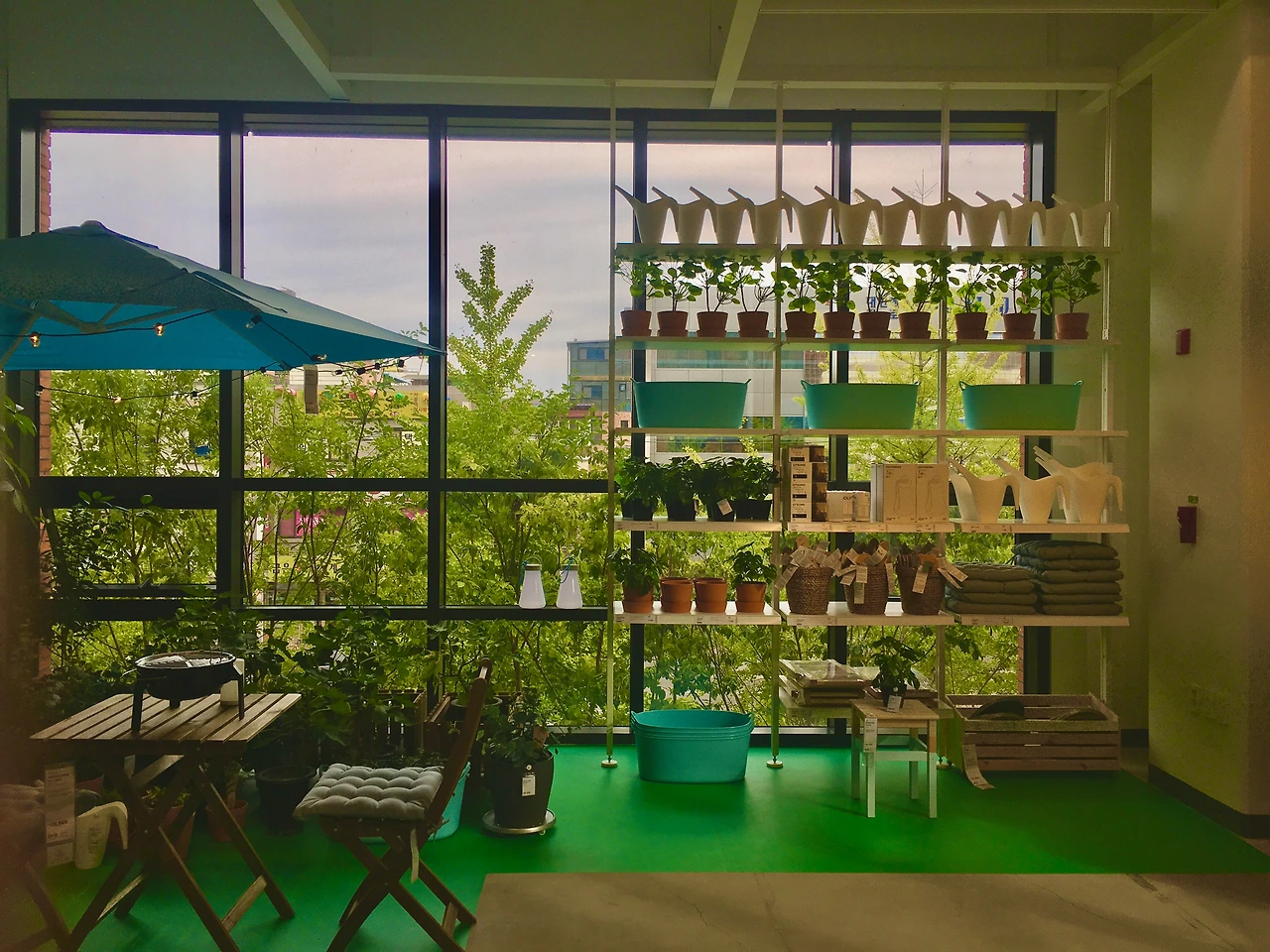 노출 콘크리트로 나무를 막는 건 한계가 있다. 공간이 단조롭기 때문이다. 이를 보충하기 위한 가장 좋은 방법은 식물을 공간에 놓는 거다. 식물은 공간에 계절감을 가져온다. 블루보틀 같은 경우 전담 플로리스트를 통해 주기적으로 매장 꽃꽂이를 바꾼다. 로컬 스티치 서교 2점은 건물 앞에 가로수가 가득하기에 식물을 사용해 계절감을 끌어오기 상대적으로 유리하다. 로컬 스티치는 이러한 지역 특징을 활용한다. 공간 안에 많은 화분을 놓아 계절감을 끌어온다. 이를 통해 나무를 통해 제거한 차가움을 더 세밀하게 없앤다.