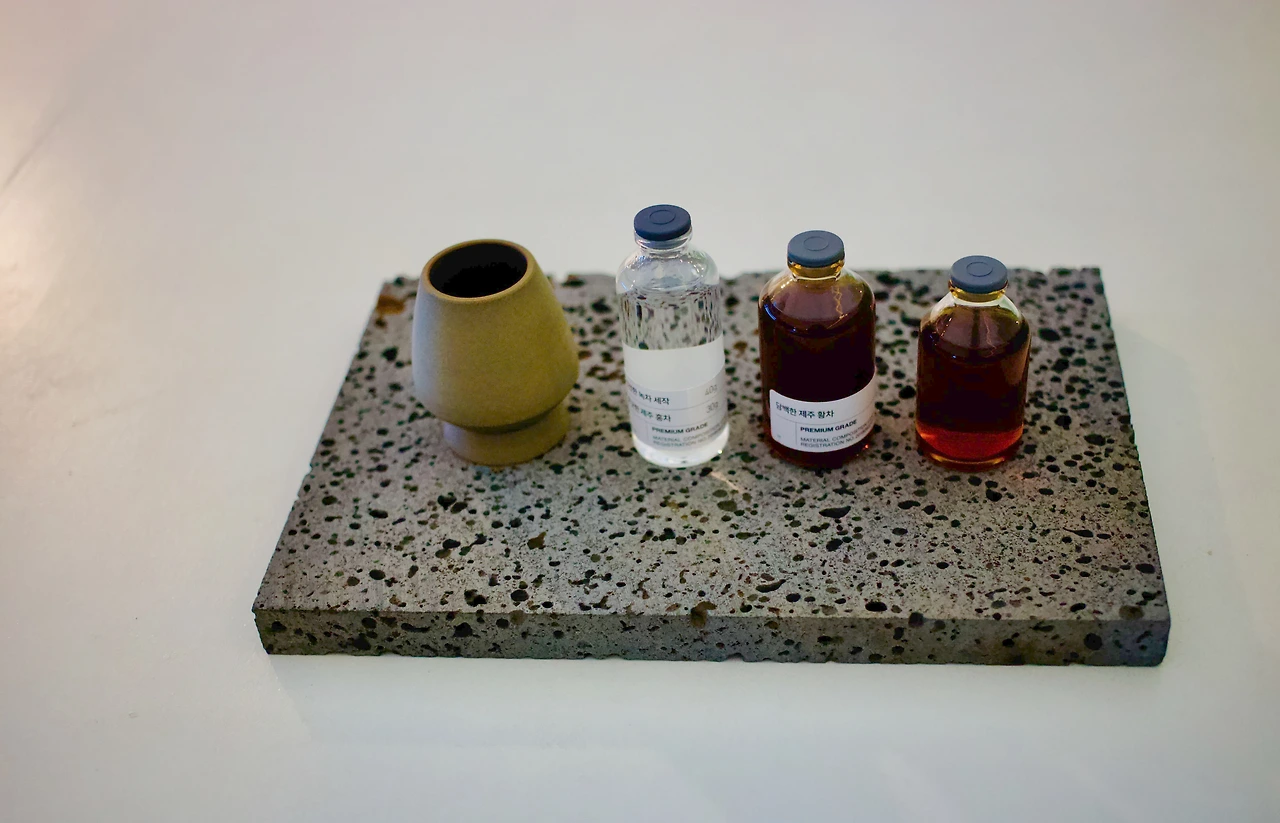 카페동과 달리 쇼룸은 산 노루가 추구하는 ‘제품 가치와 다도'를 담았다고 할 수 있다. 이처럼 색 대비가 큰 공간에 빛이 들어오면 공간은 그림자와 빛의 조화가 자연스럽게 만들어진다. 동시에 긴장감 있는 고요함과 편안함이 가득한 공간으로 변한다. 하지만 산노루는 이러한 경험이 공간이 아닌 경험으로 이어지는 장치도 만들었다. 바로 스테인리스 트레이다.
