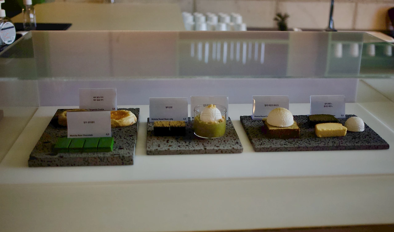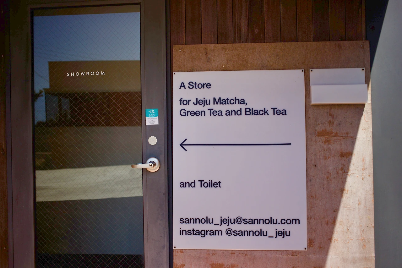 산 노루 제주의 그래픽 디자인을 면밀히 관찰하면 그래픽 디자인, 공간, 제품이 모두 동일한 흐름을 가지고 있음을 발견할 수 있다. 이 부분이 가장 두드러지는 건 쇼룸 입구에 적힌 문구다. 쇼품 문구에 적힌 문구의 배치는 산노루에서 판매하는 코스매틱 제품, 메뉴판, 스테인리스 트레이에 놓인 종이 디자인에도 모두 반영되어있다. 이러한 세밀한 부분까지 반영된 그래픽 디자인은 산노루가 오설록과 다르게 ‘세밀함’에 집중하고 있음을 알 수 있다. 그렇기에 산노루 제주의 공간은 ‘제품 판매’가 아니다.