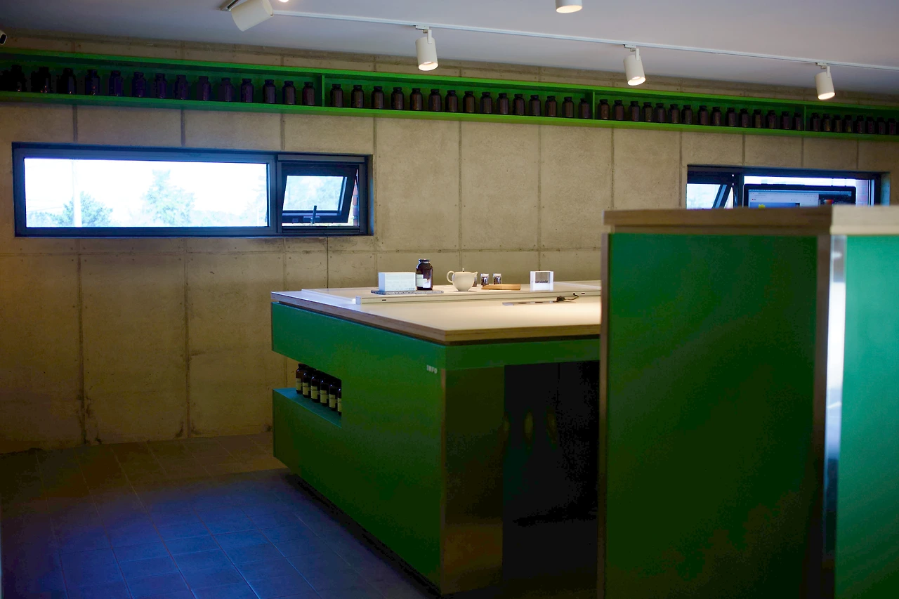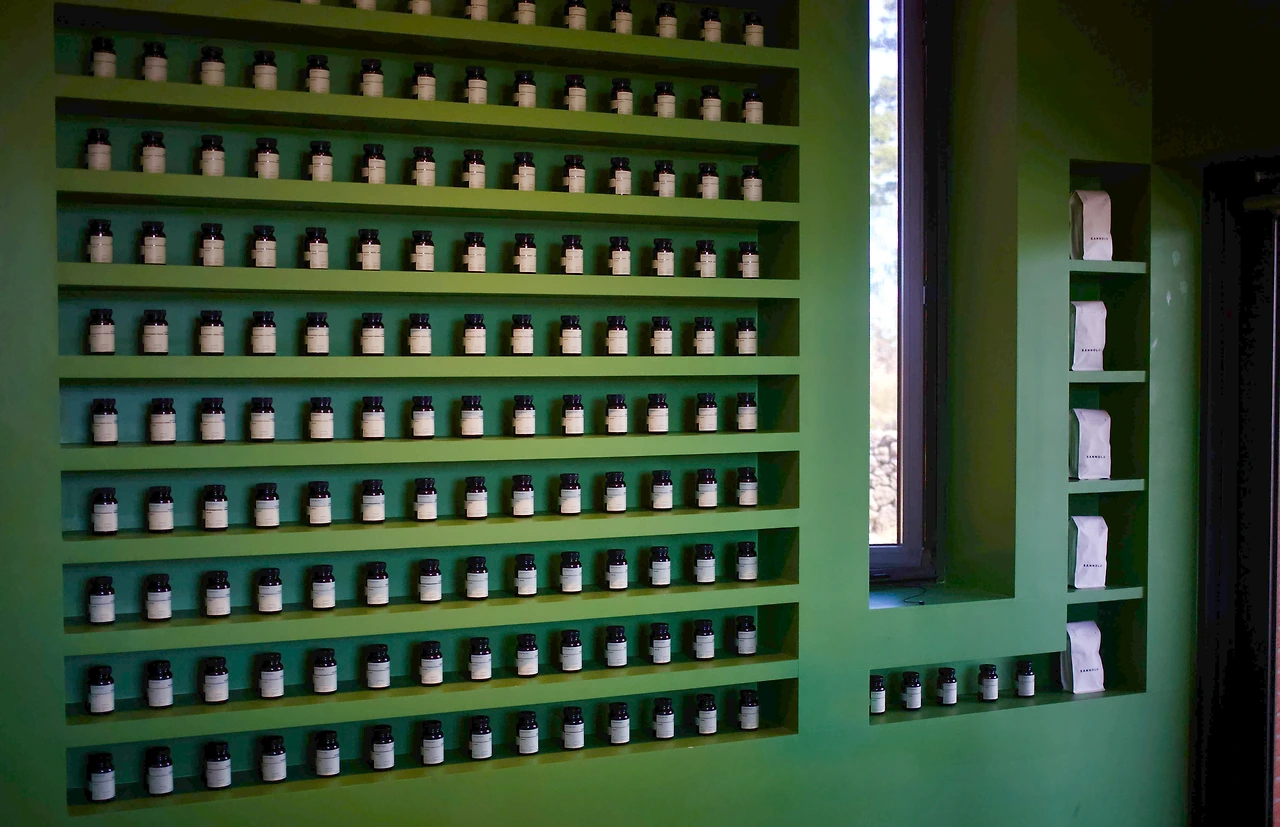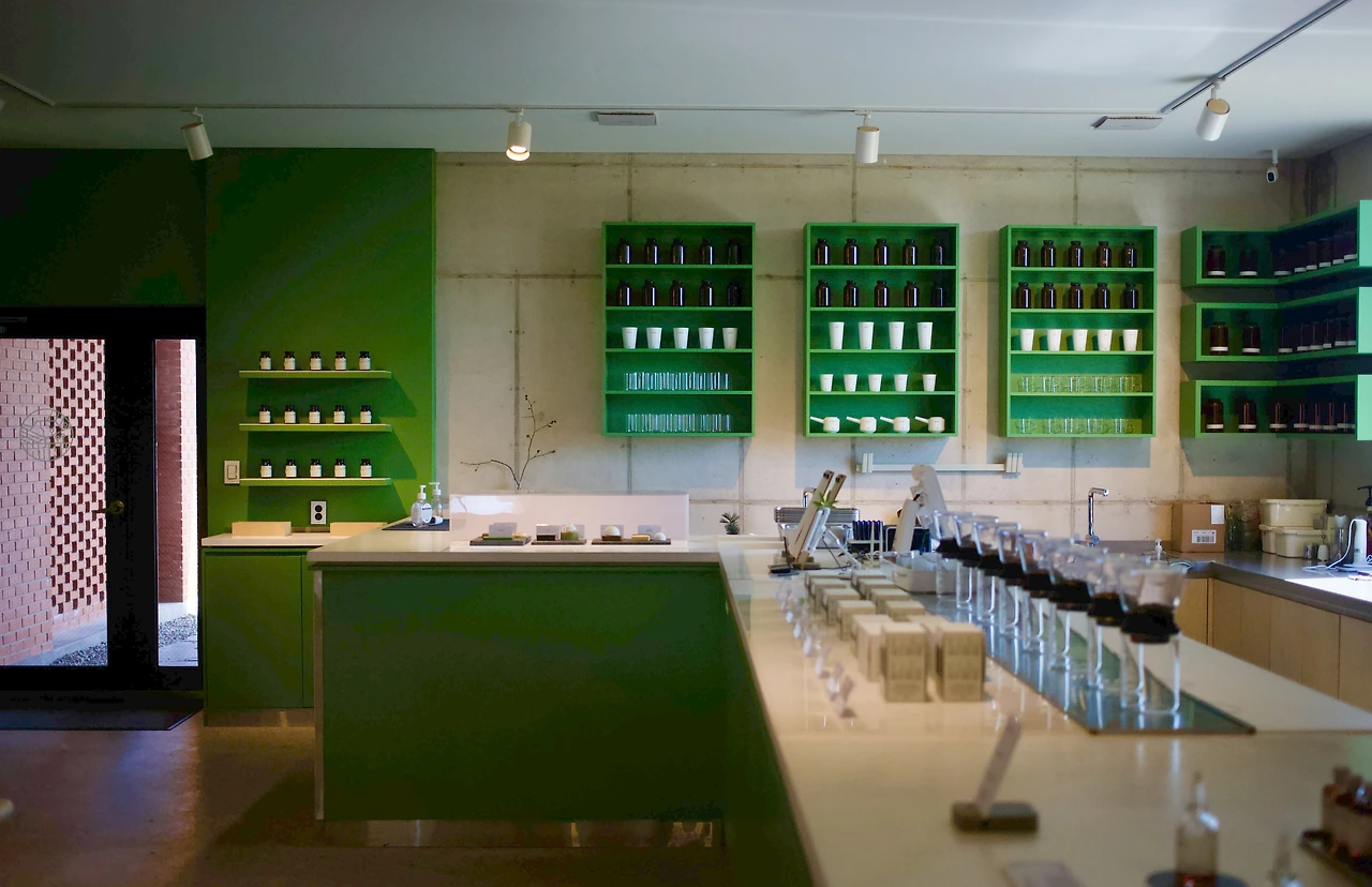 산노루 제주는 차를 기반으로 어떠한 형태의 ‘문화’를 ‘전할’ 지를 고민한다. 쇼룸, 공장, 카페로 나눠진 공간은 차와 연결되는 다양한 분위기를 구성하고 배치하는 일에 초점을 둔다.(공장은 관계자만 출입가능.) 카페와 쇼룸은 흰색과 녹색만 사용해 여백을 강조했다. 직선으로 구성된 내부 공간의 답답함을 피하기 위해 곡선으로 만들어진 가구를 배치했다. 여기에 식물을 넣어 계절감을 살렸다. 새롭다고 말하기는 어렵다. 하지만 공간이 늘 트렌디하다고 그 공간이 멋진다고 할 수 없다. 하지만 산노루 제주의 아름다움을 만드는 건 인테리어가 아니다.
