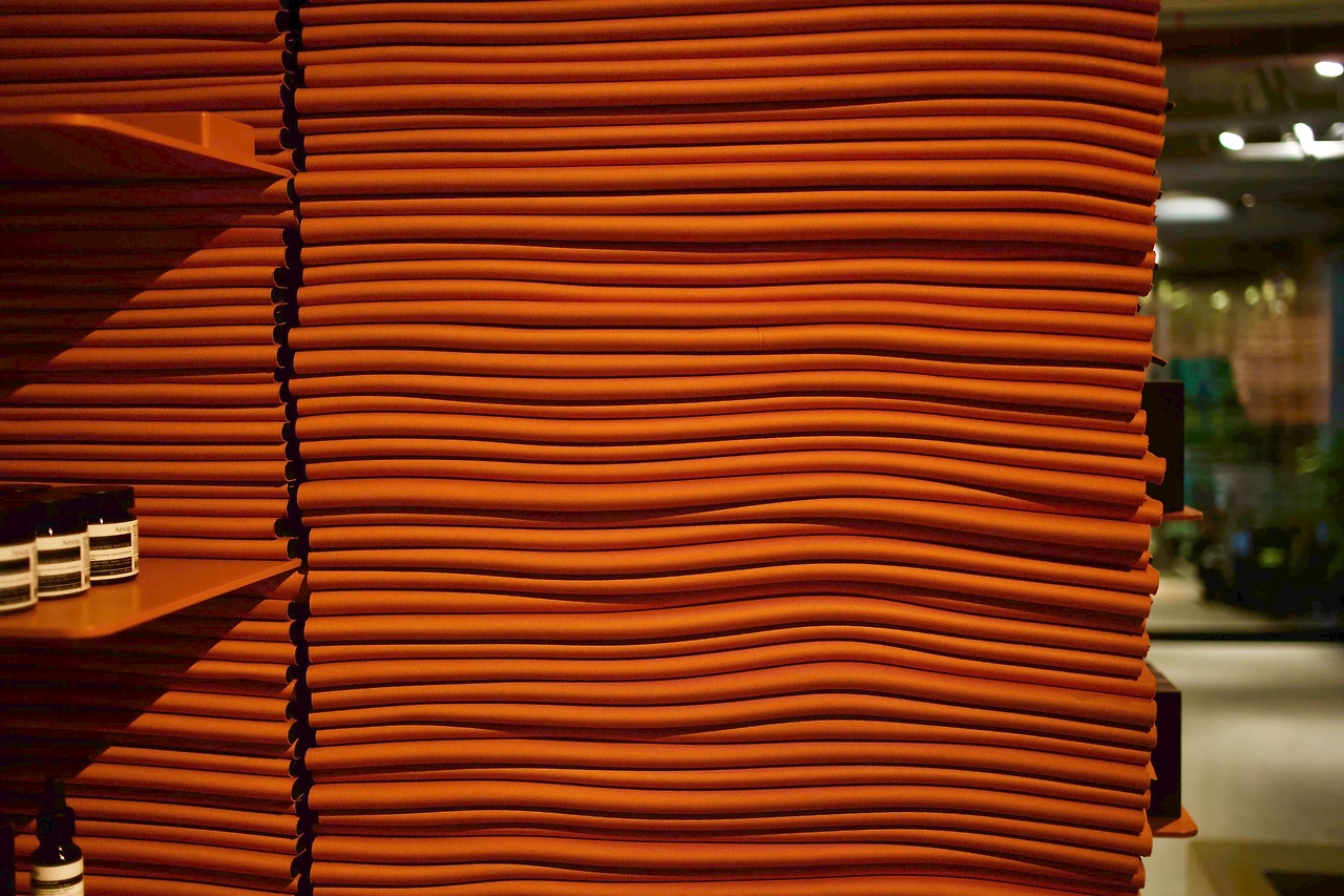 이솝 제주 공간의 핵심은 해녀복에 사용한 원단을 쌓아 올려 만든 벽이다. 해녀복에 사용한 원단 안감은 네오프렌이라는 합성고무이다. 겉감은 고무 재질을 덧입힌 특수 원단이다. 이솝 제주 매장에 에서 가장 공간을 차지하는 이 벽은 제주도를 상징하는 오브제다. 동시에 제품 진열장이자, 직원들이 사용하는 공간이기도 하다. 해녀옷 원단을 기준으로 공간이 나뉘는 셈이다. 이는 자연스럽게 이솝 매장에서 내부인인 이솝 직원과 손님을 나눈다. 마치 제주도를 찾아오는 외지인들과 내지인을 나누듯이 말이다.