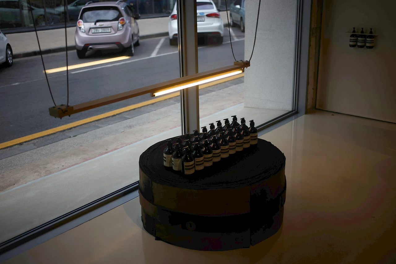 해녀복 원단으로 만든 이 공간은 전혀 기대하지 않은 단절감을 만든다. 이솝 제주에서 일하는 이들은 당연히 제주도 내지인이니까. 그렇다고 이 단절감이 공간을 차갑게 하는가? 아니다. 오히려 이솝이 제주를 접근하는 방식을 설명할 뿐이다. 내지와 외지인을 나누는 기준. 취향과 취향을 나누는 기준. 이솝은 그 경계에 있다는 것을 공간감으로 전할뿐이다. 오히려 이솝은 내지인과 외지인을 모두 신경 쓰지 않는다는 메시지를 사람들에게 은유적으로 전할 뿐이다. 이솝의 전매특허인 파슬리 시드 향은 그 역할을 더 심층적으로 할 뿐이다.