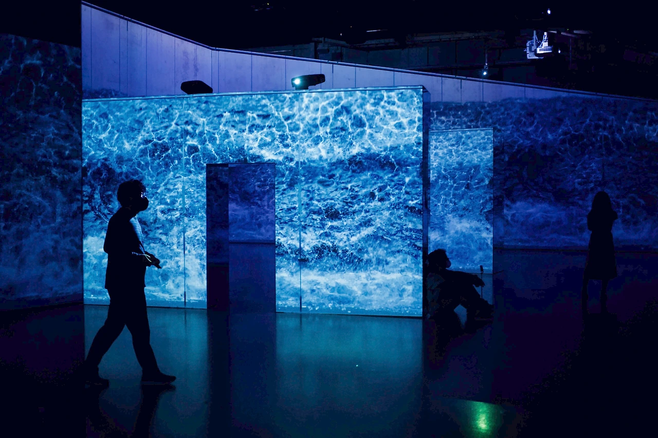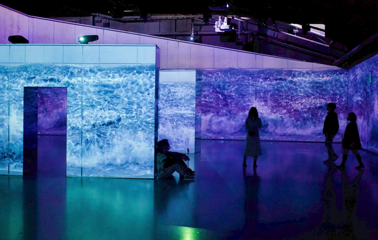 전시장 주변을 둘러보자. 적지 않은 사람들이 바닥에 앉아 있다. 벽에 기댄 이들도 있다. 조용히 이야기를 나누는 이들도 있다. 그렇다고 더 가든 안이 조용한 건 아니다. 단지 클래식 음악과 파도소리가 사람들의 존재감을 덮을 뿐이다.‘웨이브’를 보면서 홀로 명상에 잠긴 이들도 쉽게 볼 수 있다. 특히 WAVE 같은 경우 소리가 매우 디테일하기에, 홀로 벽에 기대어 멍 때리기 좋다.