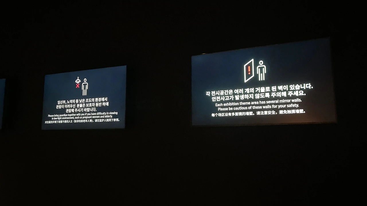 디지털 아트는 어두움이 필수다. 프로젝터로 어두운 벽에 미디어아트를 재생하기 때문이다. 이 부분을 고려한다면 ‘얼마나 어둡게 공간을 만들어야 할까?’ 하는 과제가 생긴다. 어두울수록 디지털 아트는 더 잘 보인다. 하지만 공간이 어두울수록 사람들이 움직이는 동선 입구, 화장실을 찾기 어렵기 때문이다. 이 부분은 분명히 신경을 써야 하는 부분이다. 일반적인 갤러리는 자연광 혹은 밝은 조명을 사용해도 큰 문제가 없다. 하지만 미디어아트는 매 순간 사람들을 몰입시켜야 한다. 이를 위해서는 어느 정도 확보된 어두운 공간이 반드시 필요하다.