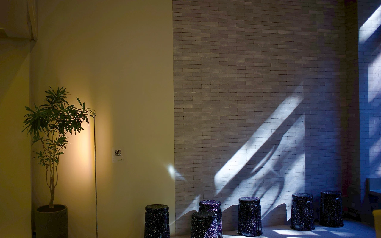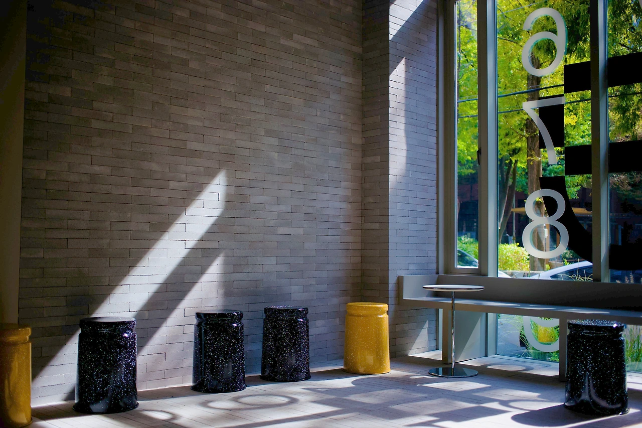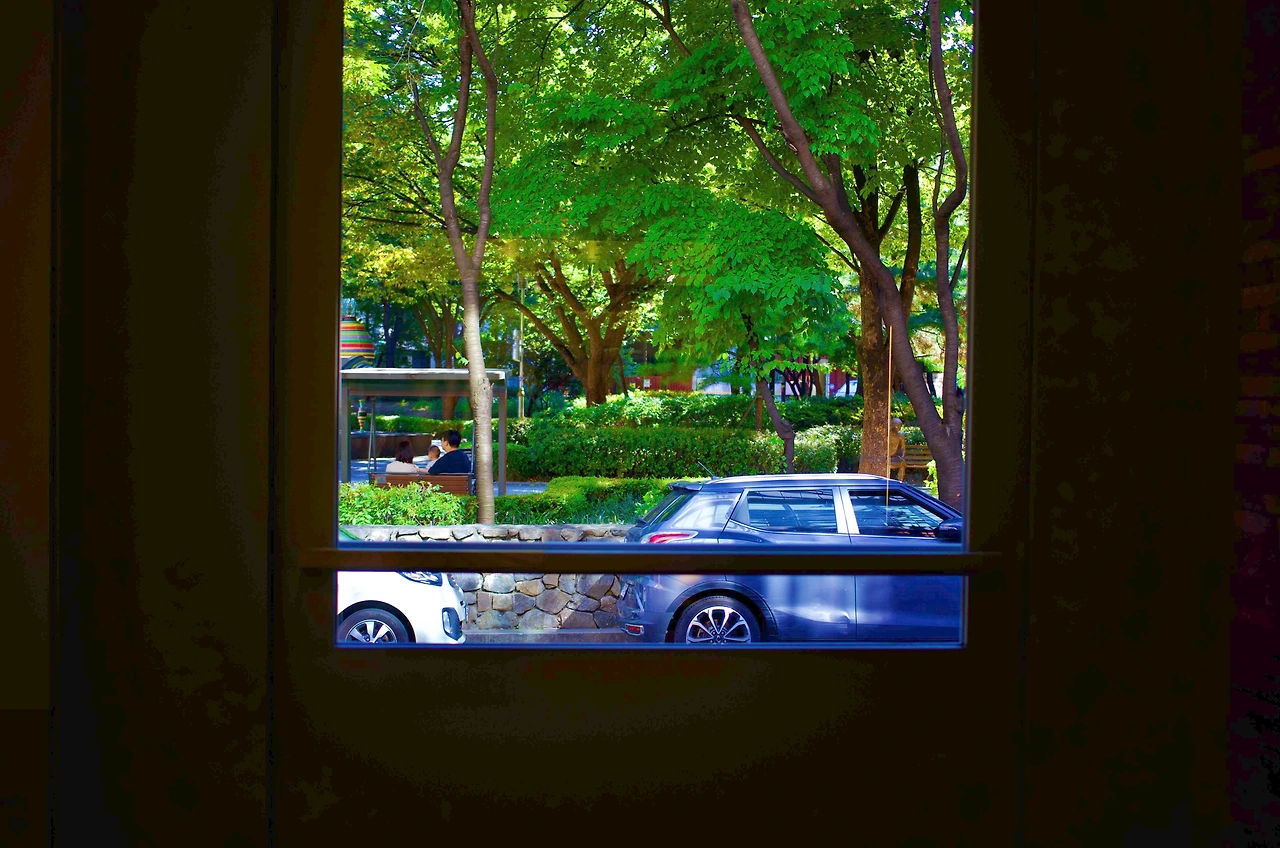 공간 묘사를 위한 소재 배치에도 공을 들였다. 가장 두드러지는 소재는 단연코 벽돌이다. 벽돌벽과 나무를 같이 사용해 빛이 조화롭게 반사되도록 했다. 특히 1층 메인 쇼룸과 창가 벽에 벽돌을 적절하게 사용했기 때문에 공간이 따스함을 잃어버리지 않는다. H빔은 공간 경계를 나누는 목적에만 충실하다. 돌로 마감한 공간 중간에 양지윤 작가의 작품을 비치해 빛이 공간에 은근하게 퍼지게 만들었다. 철로 만든 의자와 나무로 만든 창가 좌석은 대비 감이 돋보인다. 이 대비를 빛, 향기, 음악이 채운다.