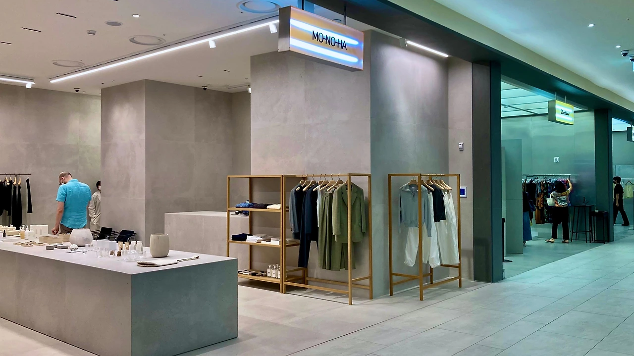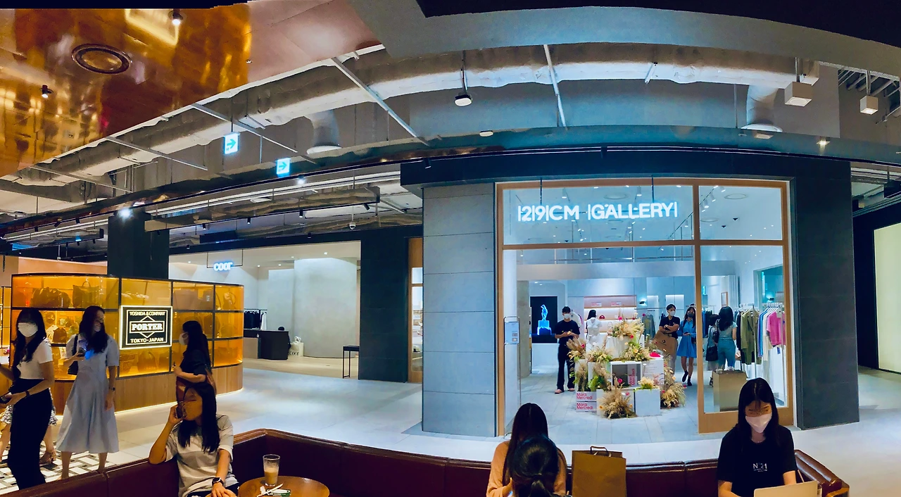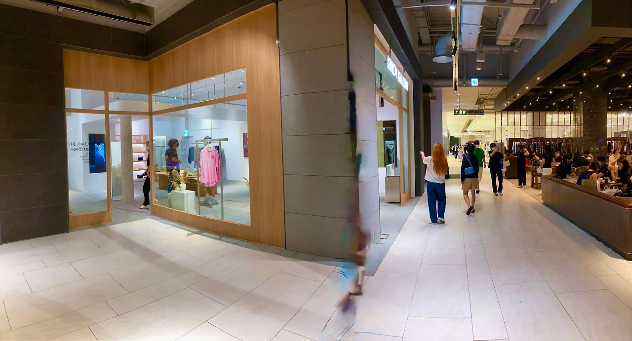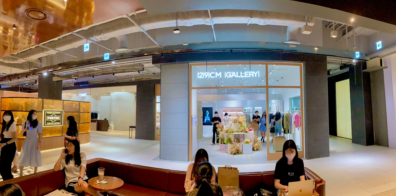 이구갤러리의 주변을 살펴보자. 이구갤러리는 더현대 서울 지하 2층에서 분위기가 크게 변하는 경계에 있다. 이구갤러리 주변의 스타벅스 리저브, 포터 매장을 살펴보자. 이 구역 조명은 주변보다 아늑하지만 다소 어둡다. 스타벅스 리저브 매장 옆을 살펴보자. 모노하와 인사일러스같은 브랜드. 부드러운 분위기를 가진 브랜드가 많다. 이 주변 바닥, 벽, 천장 색은 부드러운 파스텔톤이다. 나이스 웨더, 나이키, 아디다스가 입점한 구역과 다르다.