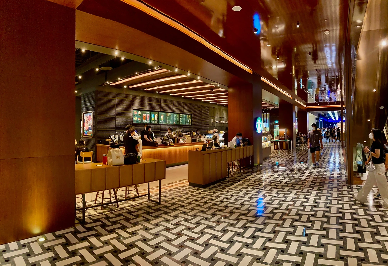사진은 이구갤러리 옆에서 바라본 스타벅스 리저브다. 사진을 보자. 스타벅스 리저브 주변의 조명, 벽, 천장에서부터 이구갤러리까지 이어지는 동선이 일관적이라는 걸 알 수 있다. 진한 갈색 벽과 나무 마감은 이구갤러리를 들어내는 모습에서 끝나지 않는다. 스타벅스 리저브까지 와도 통일감이 이어진다. 이러한 세밀함은 이구갤러리를 ‘감도 높은’ 공간으로 만든다.