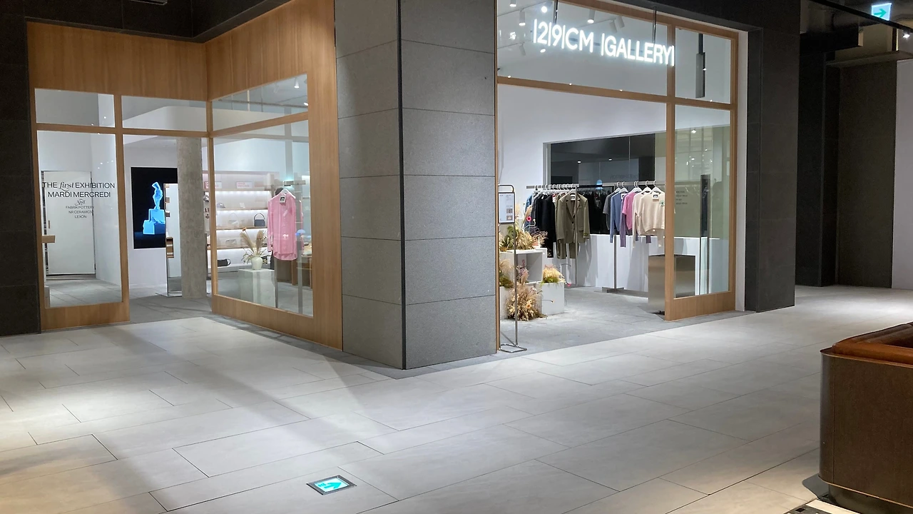 모노하로 이어지는 이구갤러리의 다른 벽은 진한 회색이다. 각기 서로 다른 톤의 회색 벽이다. 29CM는 벽 옆에 갈색 나무 프레임을 넣어 공간이 무거워지는 걸 막았다. 또한 나무 프레임을 통해 사람들에게 공간 전체를 편하게 보도록 했다. 매우 사소할지 모른다. 하지만 이러한 디테일은 매우 중요하다. 이구갤러리가 지향하는 공간. 이구갤러리가 더현대 서울에서 맡은 역할이 무엇인지 명료하게 보여주기 때문이다.