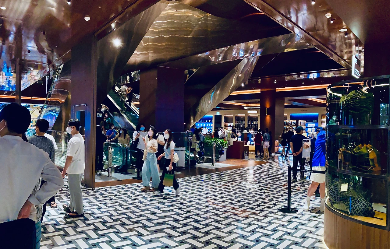 지하 2층은 아이보리, 진한 갈색, 회색. 이 세 가지가 공간을 이루는 중심 색이다. 이걸로 끝이 아니다. 현대 백화점은 다양한 팝업스토어를 설치할 수 있도록 지하 2층을 다양하게 만들었다. 하지만 입점 브랜드의 분위기를 고려해 기본색을 기반으로 바닥, 천장, 벽 색에 변화를 주었다.