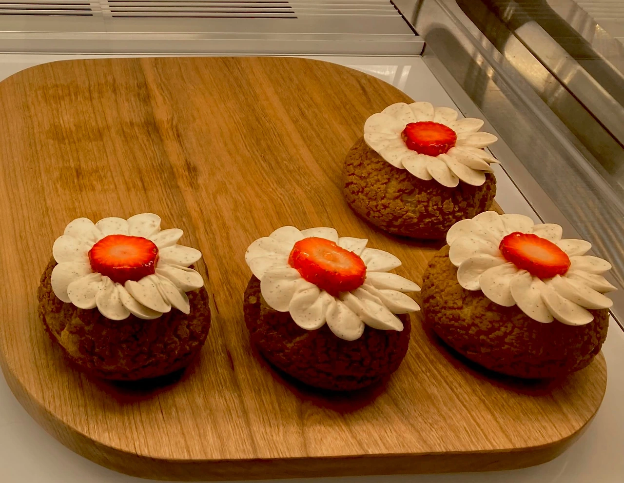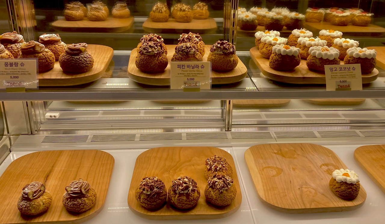 에끌레어의 절반정도 되는 살랑보도 마찬가지다. 파리브레스트도 마찬가지다. 조금은 다르다. 원형으로 만든 슈반죽을 자른다. 겉둘레에 크림이 가득 보일 정도로 넣는다. 그 주변을 형형색색 혹은 다양한 재료들로 장식한다. 케이크를 층층 쌓는 아름다움이라면? 슈는 슈 주변을 어떻게 아름답게 꾸미는 게 관건이다. 앙증맞은 슈반죽을 어떻게 아름답게 만들까? 테니의 딸기슈는 그 고민을 '테니' 나름대로 해석했다.