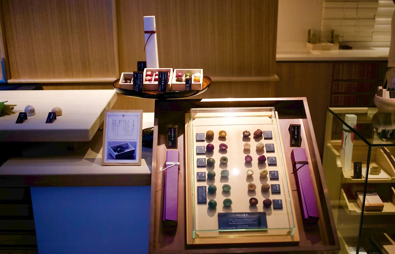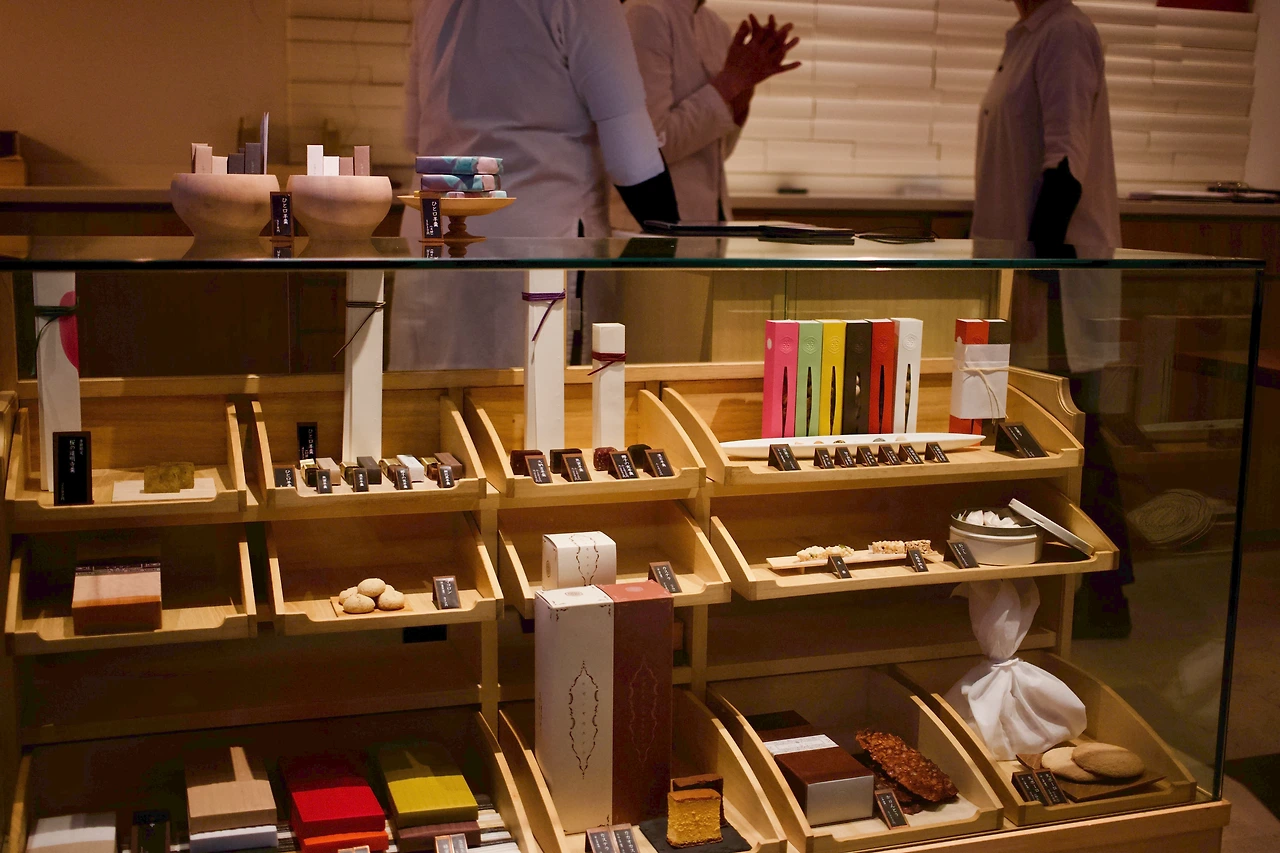 특히 도쿄 마루노우치 미쓰비시 UFJ빌딩의 1층에 위치한 히가시야 맨 마루노우치는 이와 같은 접근을 적극적으로 사용했다. 히가시야를 만든 디자이너 오가타 신이치로는 다양한 조명, 진열대, 그릇, 패키지에 곡선미를 활용해 빌딩 내 강렬한 '직선' 분위기를 일본 특유의 미니멀한 분위기로 바꾸었다. 사진을 살펴보자. 히가시야 맨 마루노우치 내부에는 직선적인 패키지 안에 원형 화과자샘플은 물론, 곡선미가 돋보이는 화과자들을 배치하여 곡선미를 섬세하게 표현했습니다. 또한 각 상품 진열장을 곡선으로 디자인하여 부드러운 분위기를 만들었다.