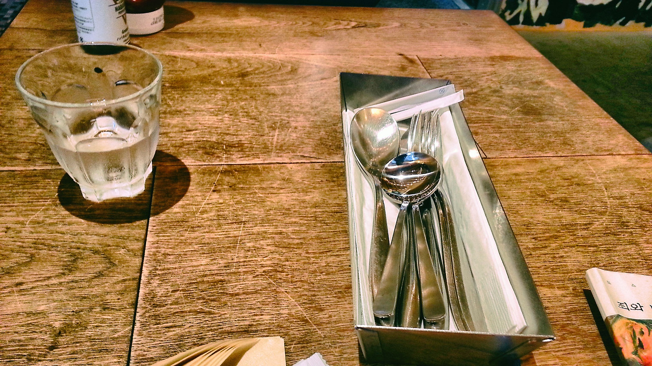 포크와 나이프가 담긴 통은 의외로 아이를 동반한 손님에게 큰 도움이 됩니다.