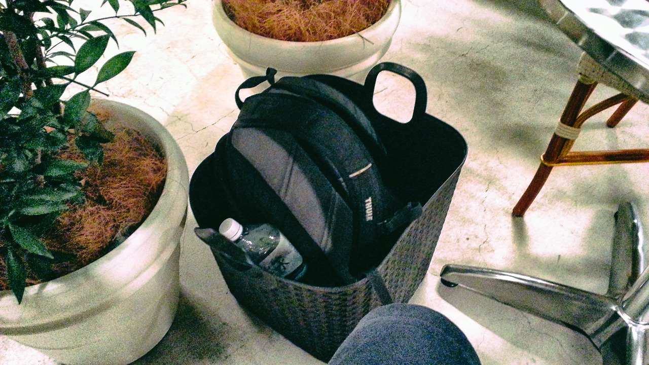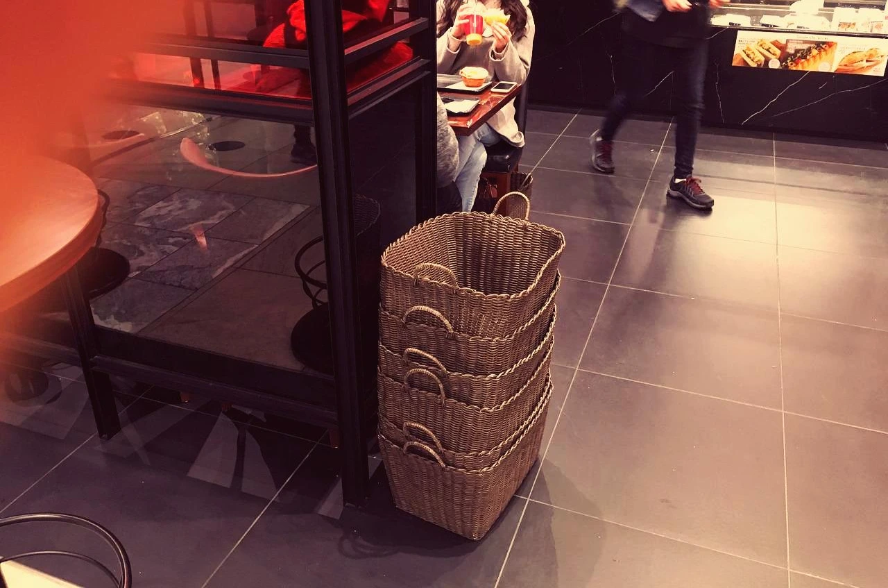 대다수 손님들이 카페 자리에 앉으면서 바구니에 짐을 보관합니다.