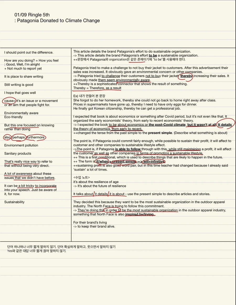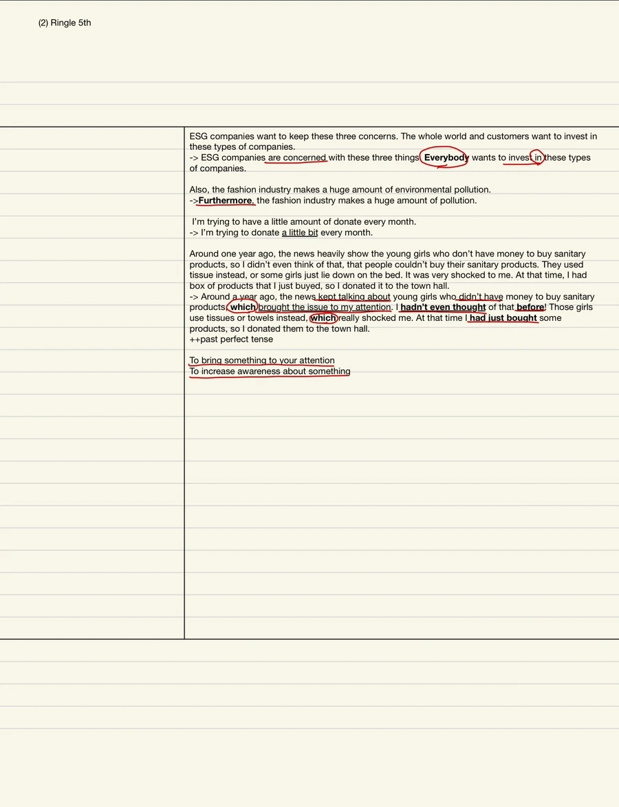 링글 수업을 하고 나서는 아래와 같이 복습집을 만들고 있다. 왼쪽에는 튜터가 말한 것 중에 새새롭거나 알았지만 직접 쓰긴 어려웠던 표현, 오른쪽에는 첨삭받은 내용, 패러프래징한 부분을 정리했다. 그리고 아래칸에는 내가 생각한 수업 후기를 적어두는데, 나는 말하면서 자주 웃느라 발음을 너무 뭉갠다는 것을 발견했다. 영어로 표현이 잘 안 되면 아무래도 웃어넘기려는 경향이 있는 것 같다.(고치려고 하지만 한 달째 못 고치는 중) 링글 수업 직후에 복습을 하면 좋지만, 녹음본과 튜터 첨삭이 수업 끝나고 한참 뒤에(반나절 뒤, 또는 다음 날) 이뤄지는 경우가 많아서 자꾸 복습을 미루게 된다. 아무튼 수업 후 복습은 중요하다.