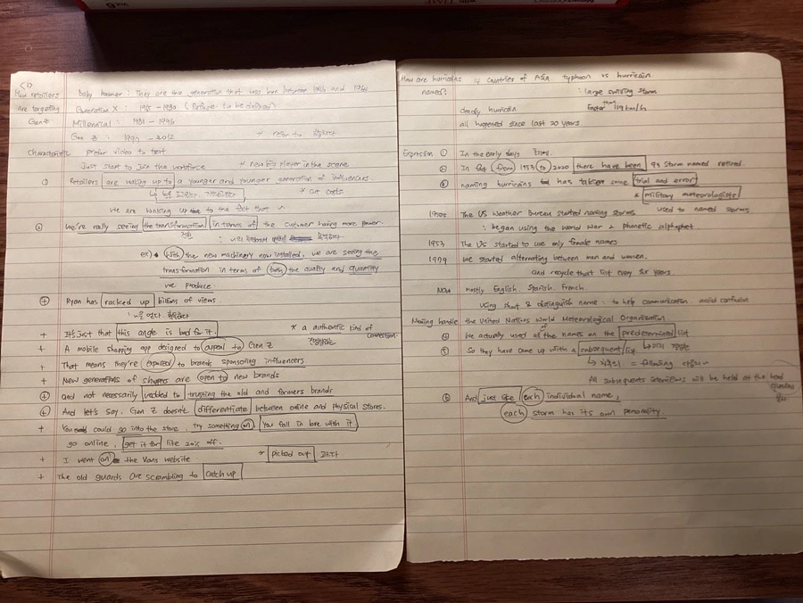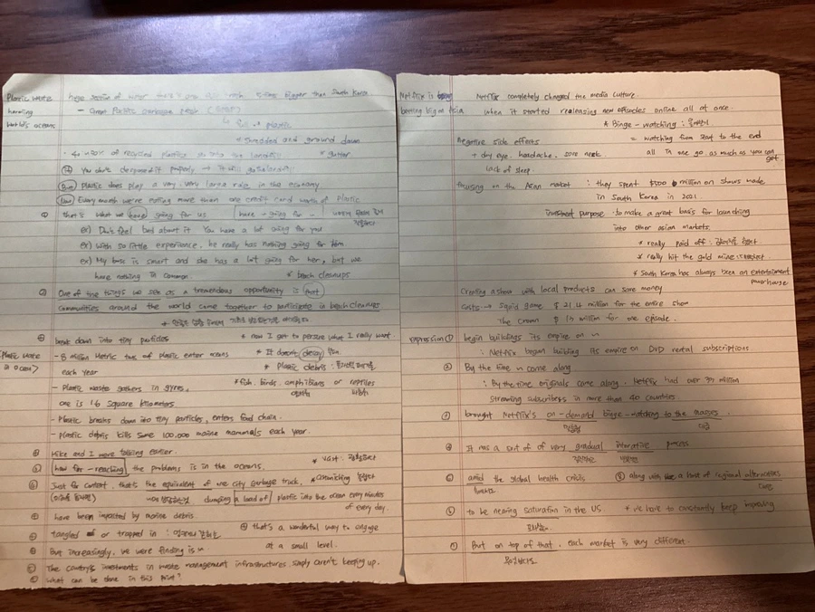 역시 손글씨가 편해서 종이에 표현법 위주로 정리하다가 뉴스 내용이 내 흥미와 부합할 때는 아래와 같이 내용 정리도 해봤다. 주식, 집세, 플라스틱 환경오염, Z세대, 인플레이션 다양한 주제를 건드려주니 영어로 낯선 주제를 생각해 보는 기회도 되었다. 회화 수업 때 이렇게 적어둔 ‘아이디어 소스‘ 노트를 옆에 두었다가 관련 주제가 나오면 바로 해당 페이지를 피고 얘기할 거리를 확보해서 바로바로 써먹는다. 그렇게 여러 번 건드려진 주제와 표현은 점차 내 것이 된다.