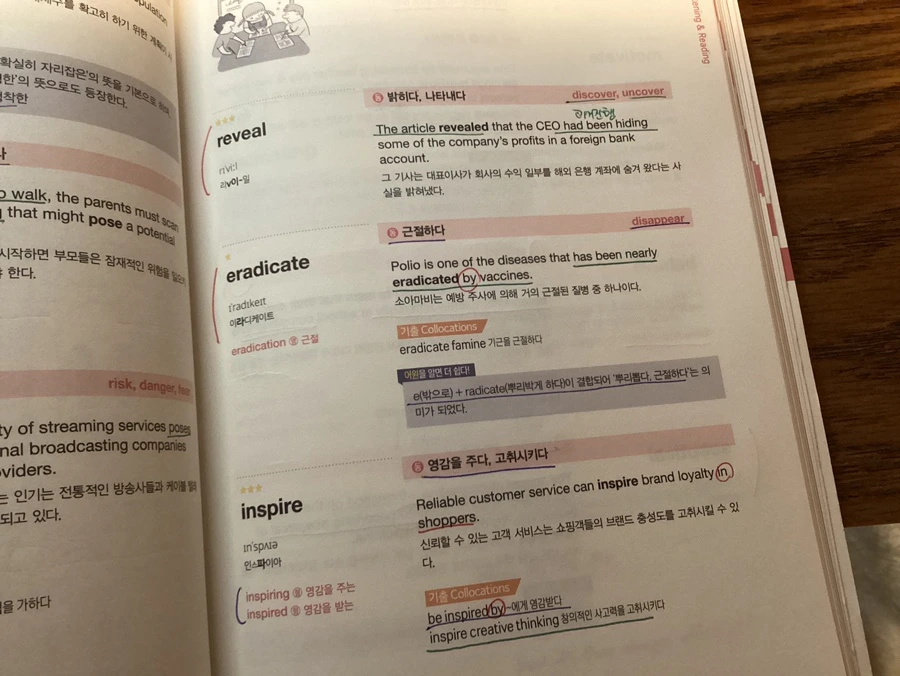 실용문법 강의로 기틀을 잡아놓고(뇌 속에 영어 책장을 세워가며), 그 뒤로는 리딩을 했다. 원래 목적은 영단어를 외우는 거였는데, 당장 간단한 것도 말하기 버벅대면서 아이엘츠 영단어장으로 아카데믹한 단어를 외우고 있자니 이게 뭐가 중요한 건가 싶긴 했다. 하지만 영단어장 두 권을 끝내면서 단어 공부 이상으로 예문 공부에 의미를 둬야 하는 것을 깨달았다. 낯선 문장 구조에 줄을 치면서 앞전의 실용문법 강의에서 배운 시제와 전치사, 문장 형태를 하나하나 뜯어봤다. 그리고 반복에 반복, 그러자 점점 영어로 된 문장을 읽는 것이 익숙해졌다.