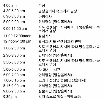 명상코스 중에는 기본적으로 4시에 기상하고 9시 반에 취침하며 하루 3시간은 의무적으로 명상 홀에서 단체 명상을 하고 1시간 정도 법문을 들어야 했다. 그 외에 8시간은 자율적으로 명상 홀이 나 숙소에서 명상을 할 수 있었다. 즉 하루 12시간은 명상을 하거나 법문을 듣는, 완벽한 스님 체험을 하게 되는 것이다. 자는 시간까지 포함하면 거의 하루 내내 눈을 감고 있는 셈이다!
