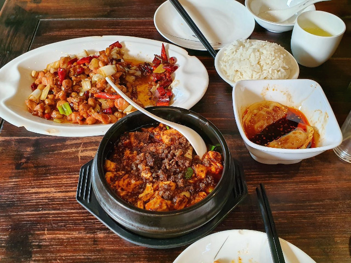 닭고기와 땅콩을 볶은 꿍바오지딩은 마늘과 생강과 파의 향이 어우러져 향긋하고 달았다. 와글와글 끓는 맵삭한 원조 마파두부와 흰쌀밥을 곁들여 먹으니 좋았다. 마파두부가 맵고 짤 때는 꿍바오지딩을 다시 한 입, 물만두를 한 입 먹다 보니 한 상을 거하게 다 비웠다.