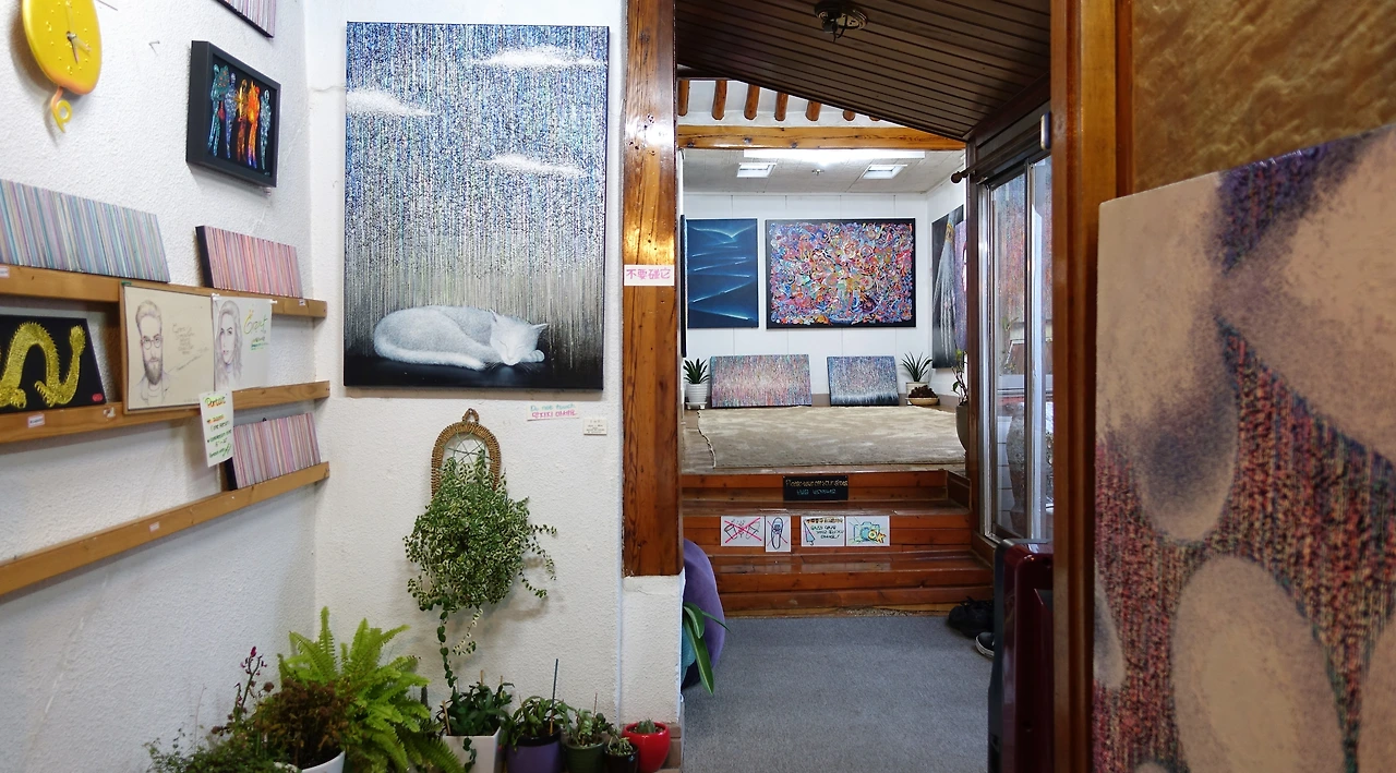 아담한 한옥 방 한 켠에 몽환적인 선묘화들이 전시되어 있는 이곳은 안성환 작가의 작업실이자 전시공간이다. 선묘화는 선의 중첩으로 이미지가 표현되는 독특한 기법으로 가느다란 선이 모여 이루어 낸 커다란 작품을 마주하는 순간 묘하게 빠져든다. 그림을 의뢰하면 즉석에서 그려주기도 하는데 외국인들이 제법 많이 요청한다. 작은 액자는 2만원부터, 관람은 무료.