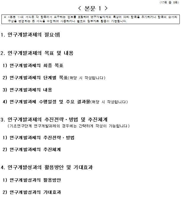 먼저 연구의 필요성을 언급해야 하고 연구의 목표와 내용, 즉 뭘 개발할지 적어야 합니다. 연구 목표를 달성하기 위한 추진 전략, 방법을 뒤에 적습니다. 끝으로 이 연구가 완료되면 어떻게 활용할지, 기대효과가 뭔지 쓰면 됩니다. 이제 목차의 흐름이 보이시나요? 이 목차를 어디에 응용할 수 있을까요?
