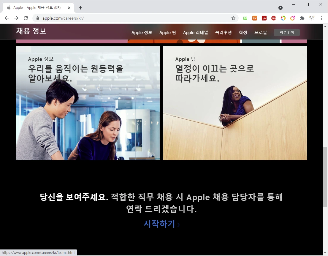 오른쪽 그림은 애플의 구인 사이트입니다. 멋진 구도의 사진, 그리고 대뜸, 당신을 보여 달라고 합니다. 화면 아래 시작하기 링크를 클릭하면 이력서를 등록하라고 합니다. 채용 정보조차 비밀인가 봅니다. 그리고 내 정보를 줘야 합니다. 테슬라는 누구나 채용 정보에 접근할 수 있게 공개했고, 애플은 정보를 바로 공개하지 않았습니다. 이처럼 채용공고로 회사의 특성을 조금 엿볼 수 있고, 정보도 얻을 수가 있습니다. 선도적인 회사에서 필요한 기술, 직무내용, 기업문화를 조금 알 수 있습니다.