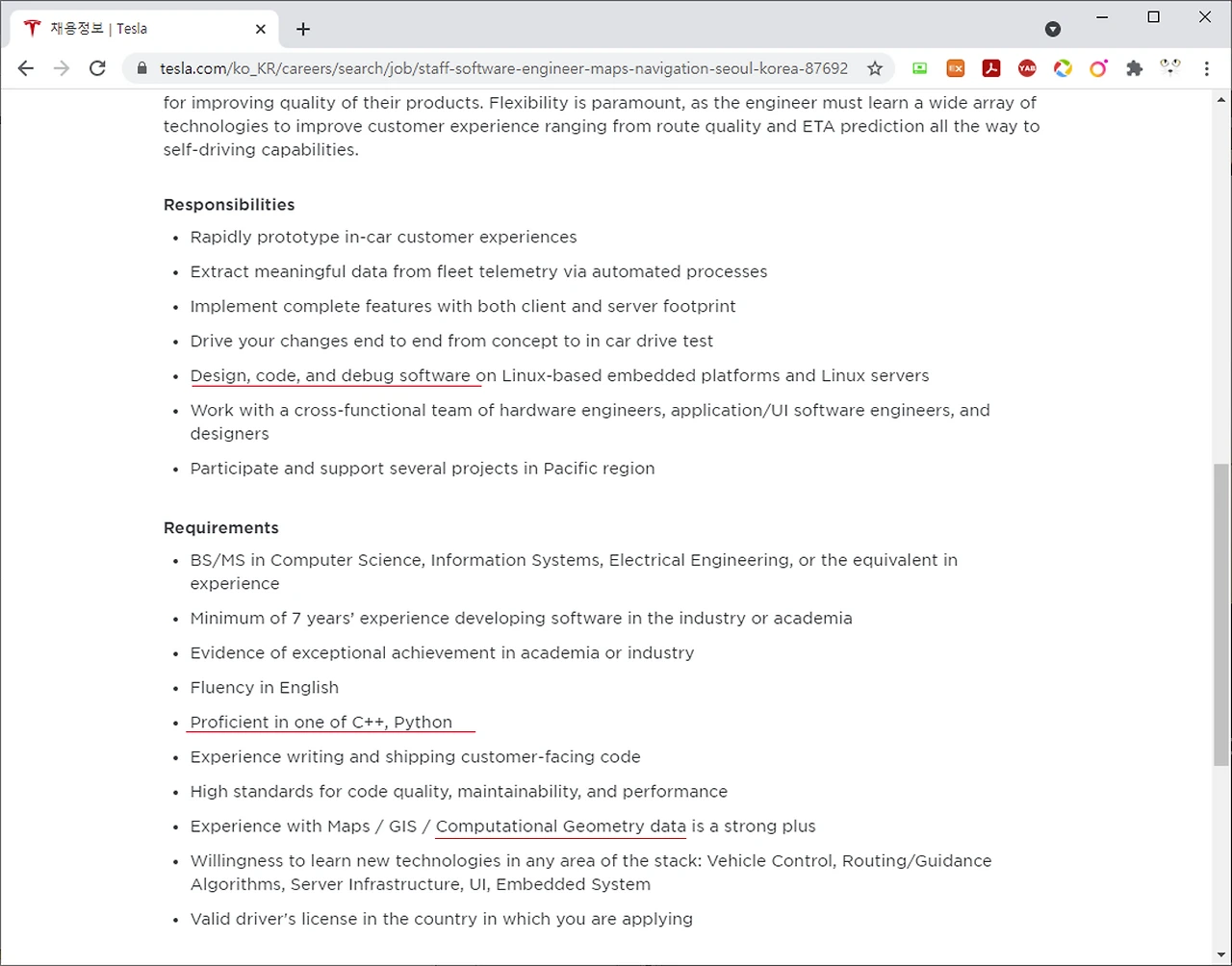 학생들이 미래의 유망한 프로그래밍 언어가 뭔지 물어봤습니다. 제가 아는 방법은 회사의 구인 사이트에서 확인합니다. 아래 그림 왼쪽은 테슬라의 구인 사이트입니다. 업무는 소프트웨어를 디자인하고, 코딩해서, 디버깅을 하고 사용하는 언어는 C++, Python입니다. C++은 1985년에 세상에 나왔는데 현재까지 쓰고 있습니다. 미래에도 사용될 확률이 높아 보입니다. Python은 인공 지능 기술의 발달과 함께 인기가 많아진 언어입니다. 머신러닝에 사용되는 라이브러리가 Python으로 만들어져 있습니다. 역시 미래에 사용될 가능성이 높습니다. 여담으로 Computational Geometry는 제가 반지 만들 때 사용하는 기술이기도 합니다.