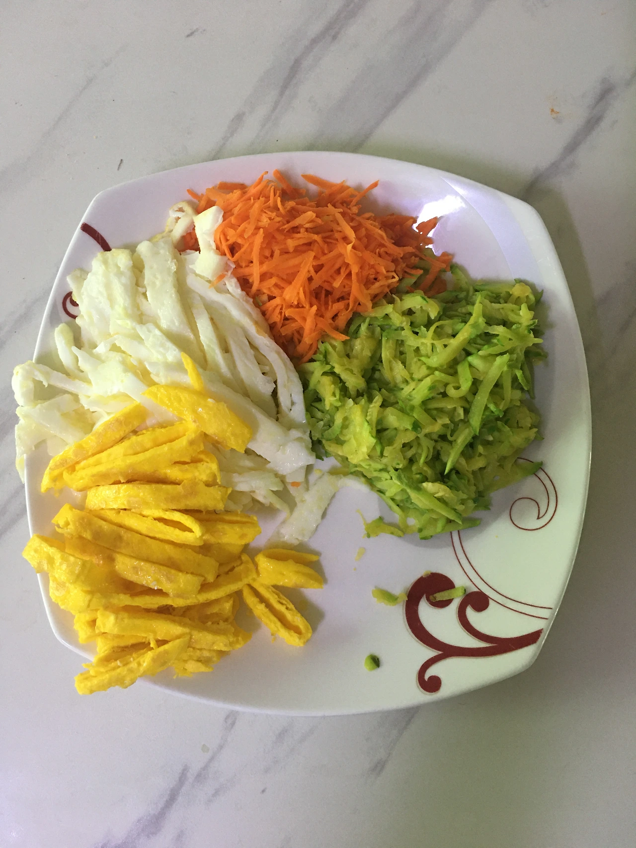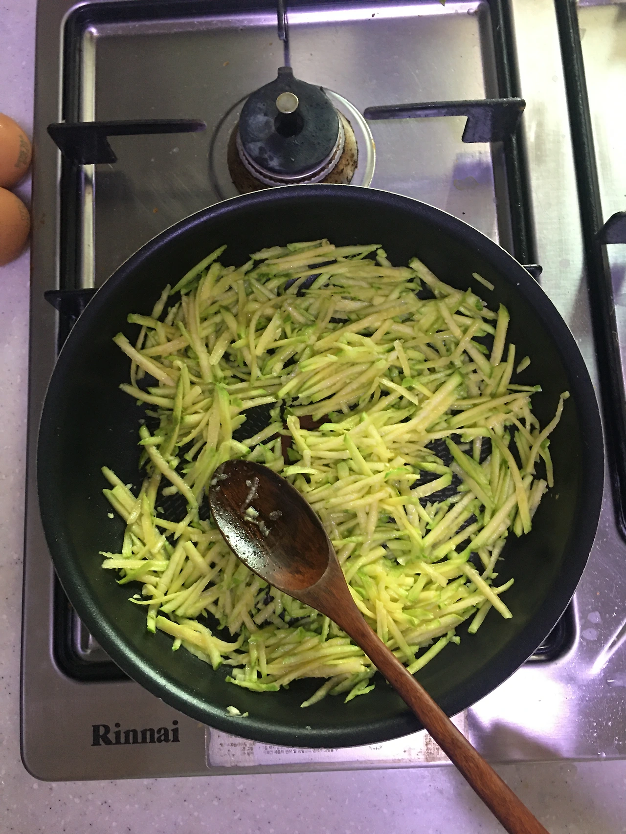 육수가 끓은 동안 고명을 만듭니다. 호박을 잘게 썰고 기름에 볶아줍니다. 호박의 물기가 빠질 정도면 됩니다. 계란은 노른자와 흰자를 구분해서 프라이를 한 다음 대충 얇게 잘라줍니다. 이때 아주 약한 불에 천천히 익힙니다. 이래야 달걀의 부드러운 맛이 고스란히 남아있습니다. 기호에 따라 당근, 시금치, 오이도 조리해서 넣으면 좋습니다. 볶을때 간장으로 간을 해도 됩니다. 저는 마법의 양념장을 만들 거라서 간장은 별도로 넣지 않습니다.