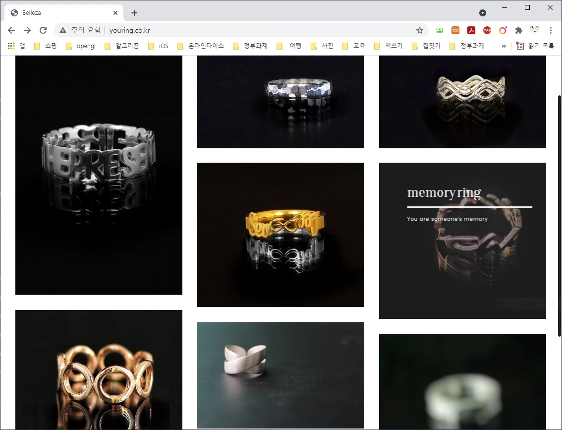 반지 사이트를 만들었습니다. 퇴근하고 집에서 작업을 했습니다. 집에 와서 밥 먹고 씻고 나면 몸은 왜 그렇게 무거운지 모르겠습니다. 아무것도 하기 싫습니다. 몸을 컴퓨터 앞에 끌고 가서 앉히기가 아주 어렵습니다. 아주 느리게 조금씩 개선해 나가고 있습니다. 오류도 많고 아직 기능이 많이 부족합니다. 제가 모르는 분야라서 공부하면서 개발하고 있습니다.