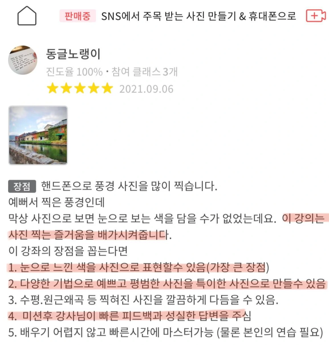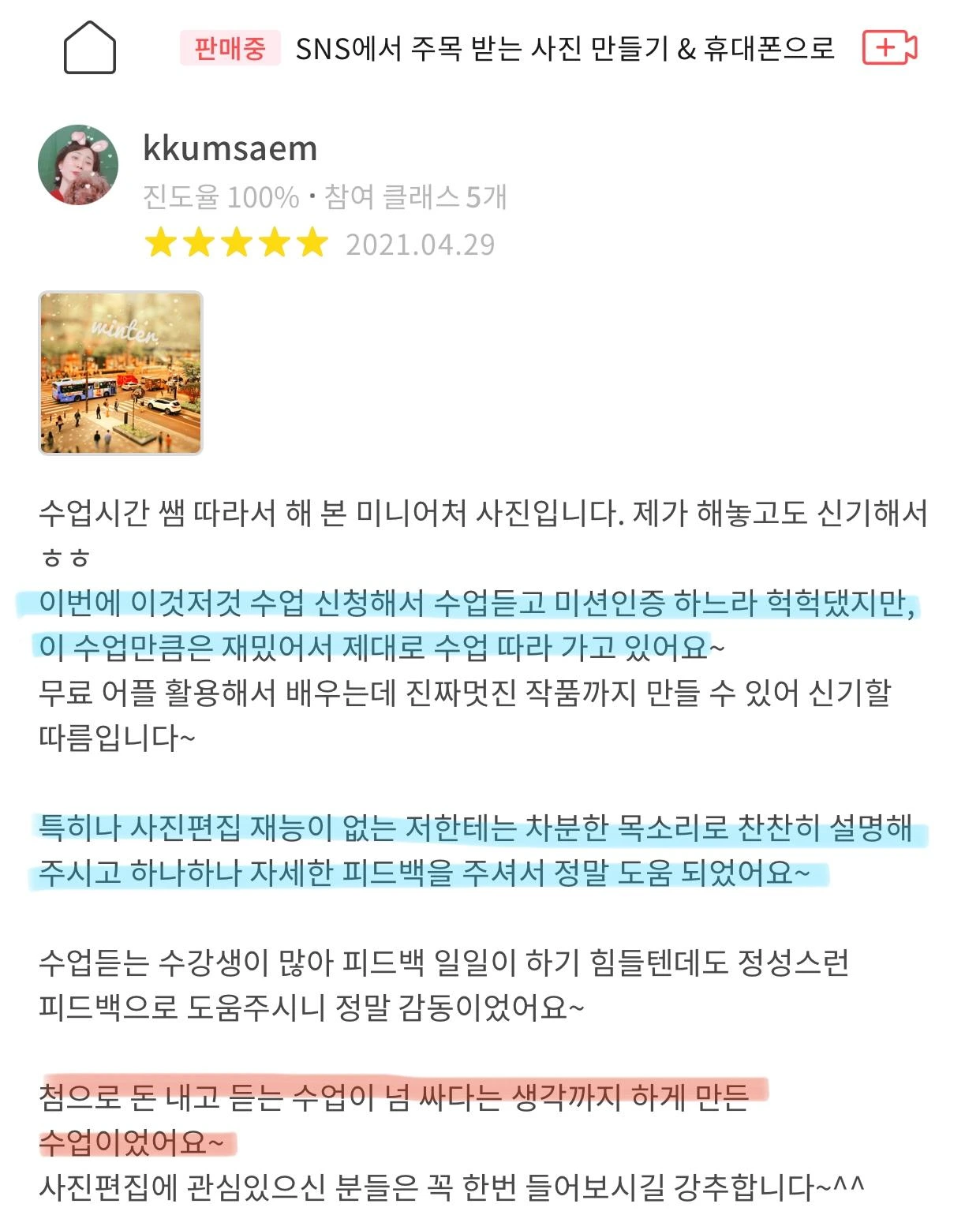 나중에 보니 사진 수업을 들은 분이 다른 분에게 추천도 해 주셨고, 인스타그램에 후기 사진도 올려주셨습니다. 운 좋게 노출이 많이 돼서 수강생이 몰렸나 추측해봅니다. 이게 바이럴 마케팅인가요.